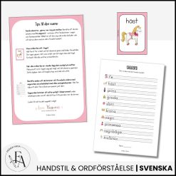 - Fyra arbetsblad med orden i versaler, gemener, endast bildstöd eller endast skrivlinjer.