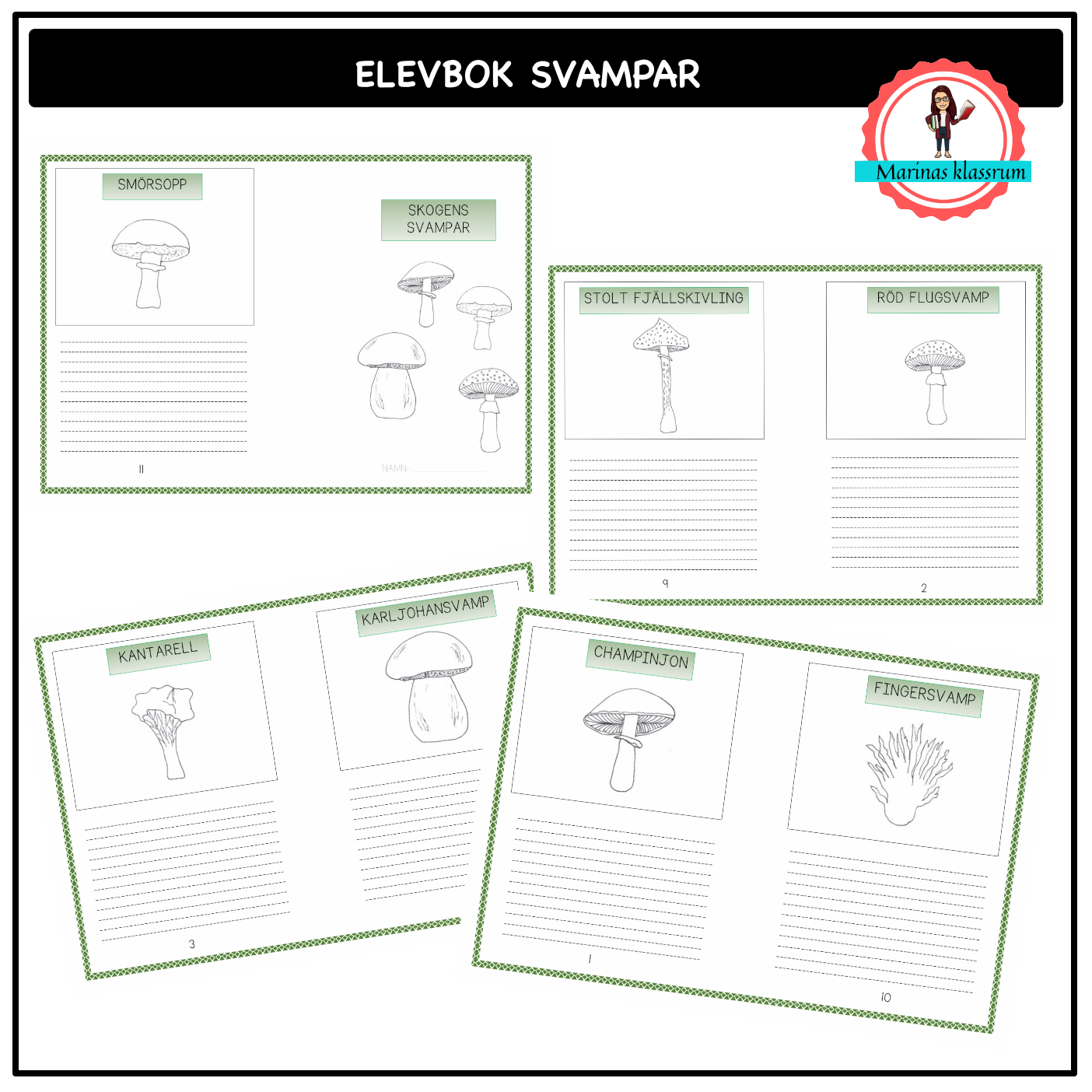 Låt eleverna måla och skriva om skogens svampar. Dessa svampar ingår: röd flugsvamp, kantarell, stolt fjällskivling, champinjon, blodriska, röksvamp, fingersvamp, smörsopp, Karljohansvamp, murkla och taggsvamp.