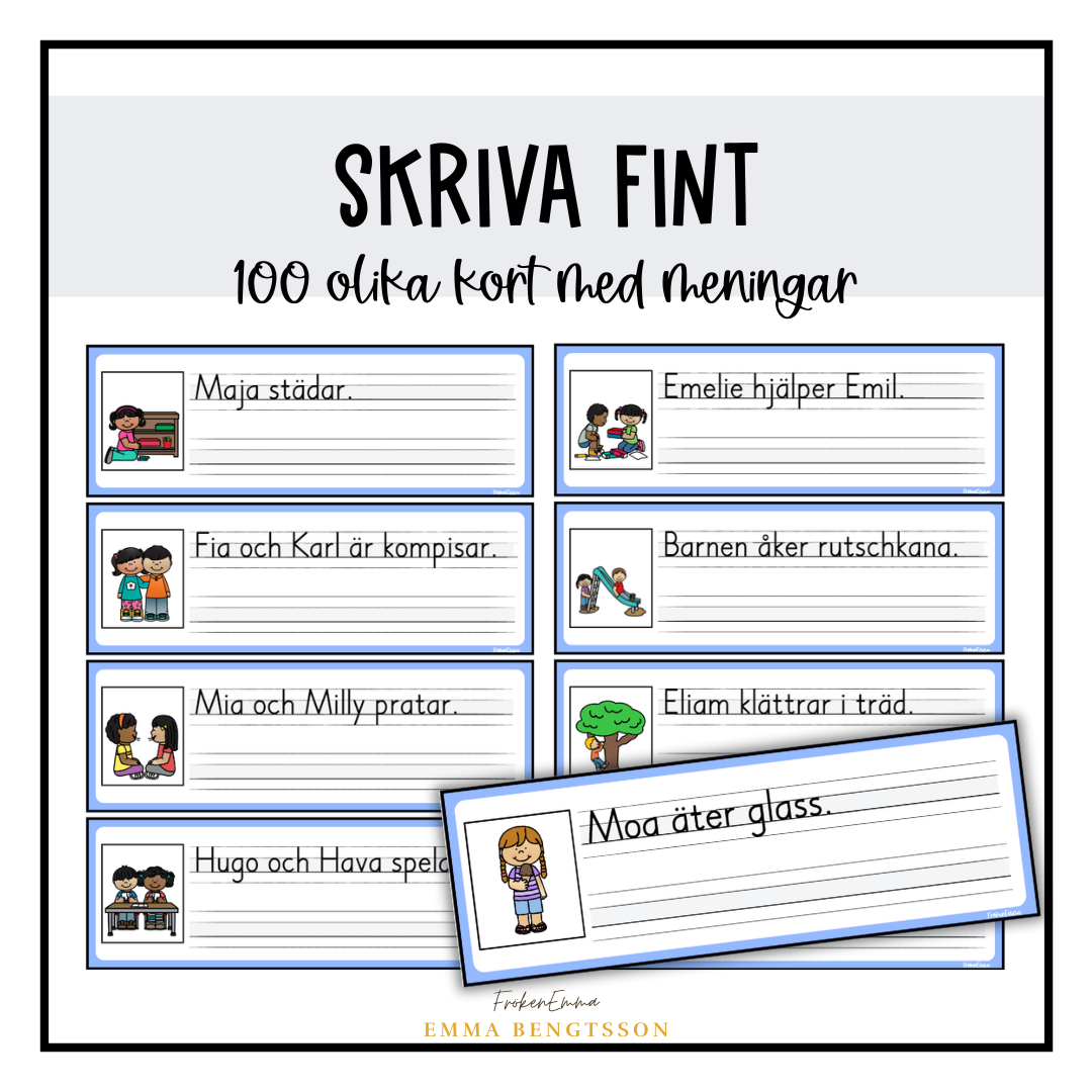 100 olika meningar skriva om och om igen! Materialet innehåller 100 olika kort med enkla meningar som ska skrivas av på stödlinjer. Perfekt att ha i klassrummet som extrauppgift. Klipp ut och laminera korten för att kunna använda dem flera gånger.