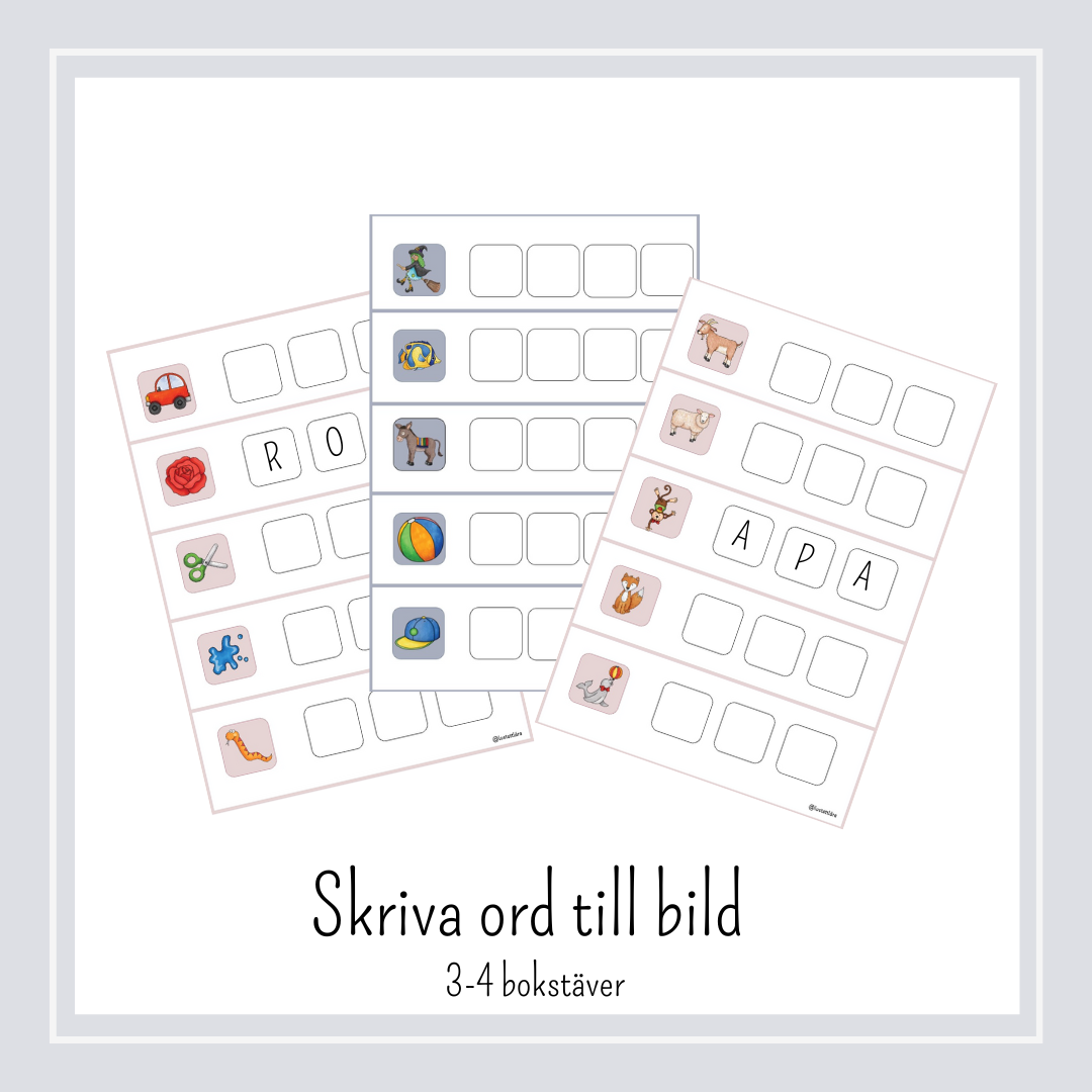 12 sidor med totalt 60 ord där man tittar på bilden och skriver ordets bokstäver i rutorna bredvid bilden.