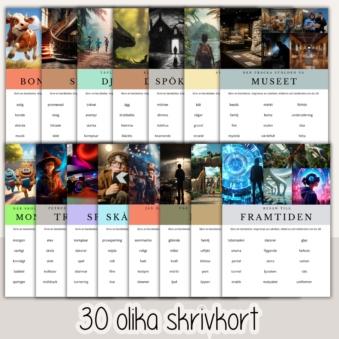 30 st skrivkort med inspiration för att starta skrivandet av en berättelse.