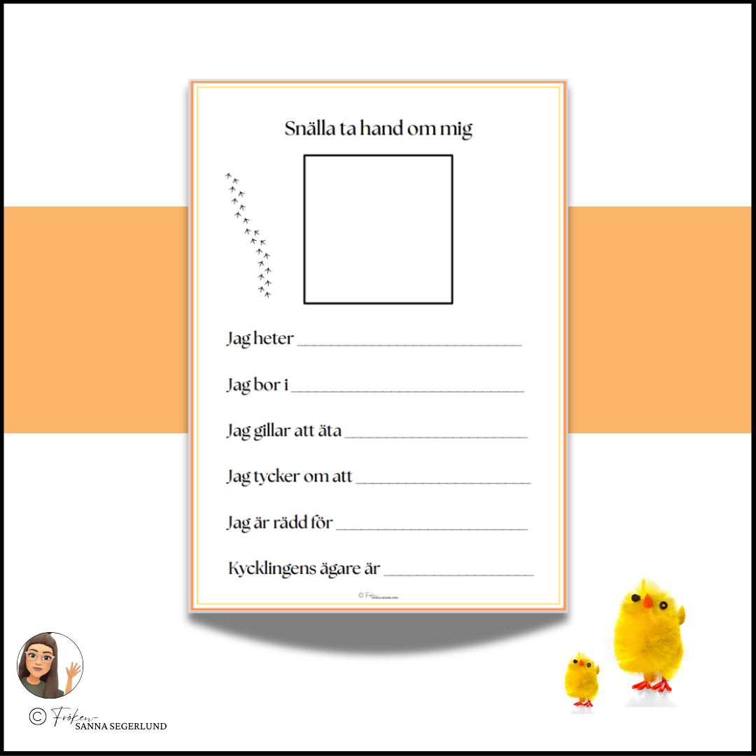 Materialet innehåller arbetsblad där eleverna får döpa sin kyckling, rita den och skriva fakta om den. Genom att skapa en relation till sin egen lilla kyckling blir skrivandet meningsfullt och spännande. Ett perfekt upplägg för att träna skrivförmåga i förskoleklass eller årskurs 1 på ett lekfullt sätt!