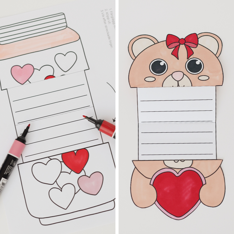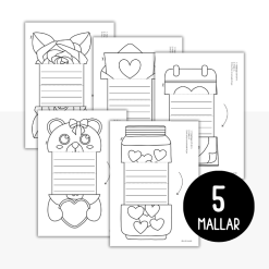 Pyssla och skriv på alla hjärtans dag i skrivmallar. Mallarna kan öppnas och stängas. Innehåller fem olika motiv: björn med hjärta, brev, kalender, ros och burk med hjärtan.