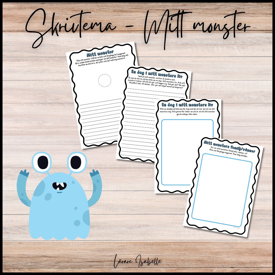 Det här är ett skrivtema baserat på ett fantasi-monster som eleverna ritar och beskriver. Jag upplever att eleverna får ett större skrivintresse när det är fantasin som styr och att det är färre som låser sig i vad de ska skriva om då. Eleverna får öva på att både skriva en beskrivande text och även en berättande text i det här temat, samt rita bilder som hör ihop med texten. Arbetsbladen går att dela ut ett i taget eller sätta ihop till ett häfte. Jag och mina elever har arbetat med temat under en veckas tid men det går givetvis att göra på många olika sätt.