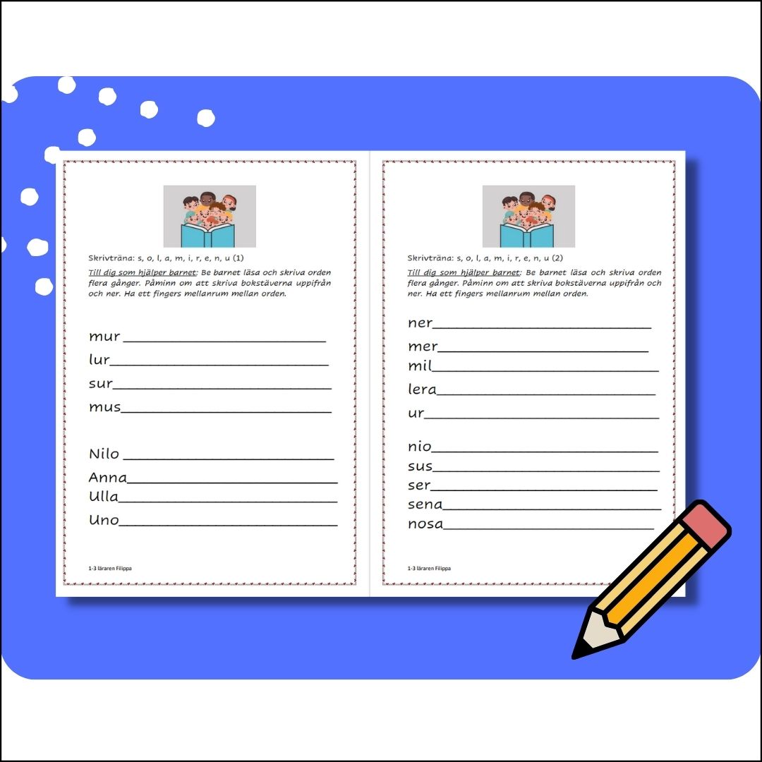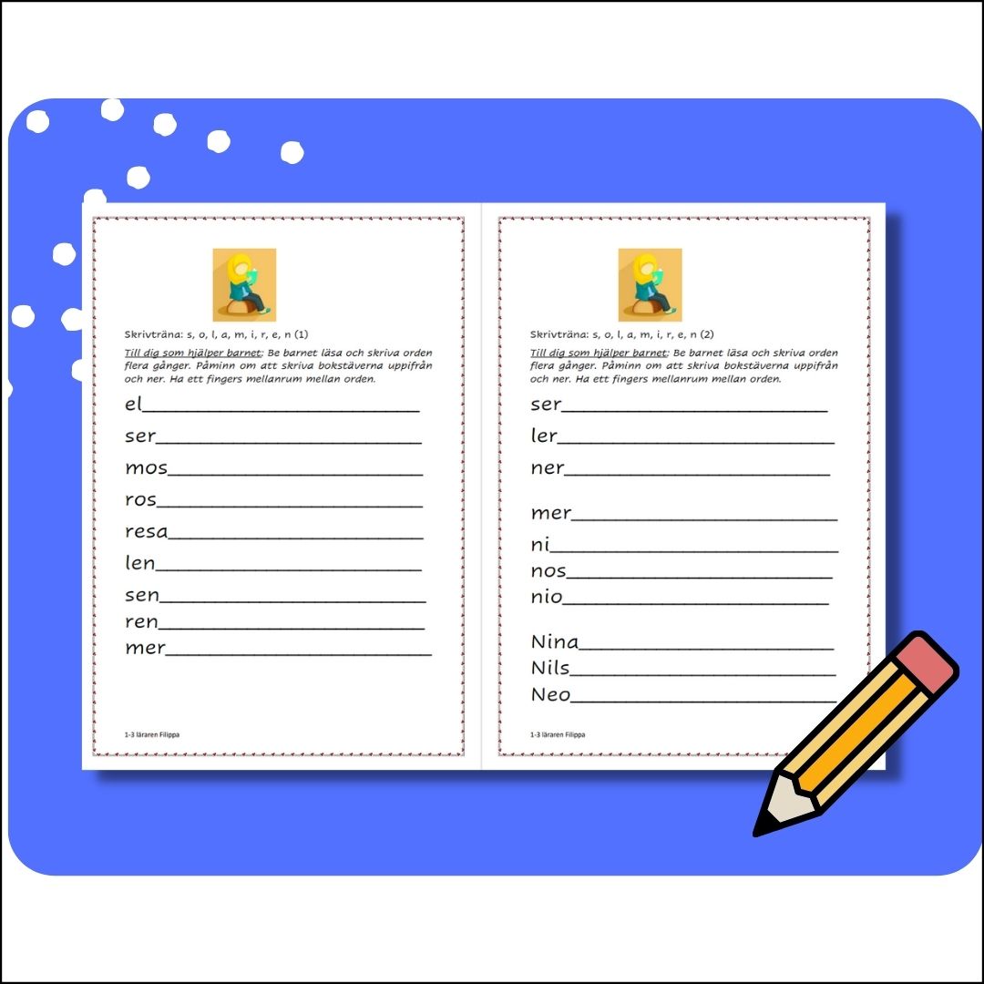 – Gå igenom bokstavsljuden och arbeta med en bokstav i taget så eleverna kan ljuda den och skriva den rätt. Följ gärna ordningen om du vill som jag har i läslistorna. Då passar dessa skrivträningsblad bra.
