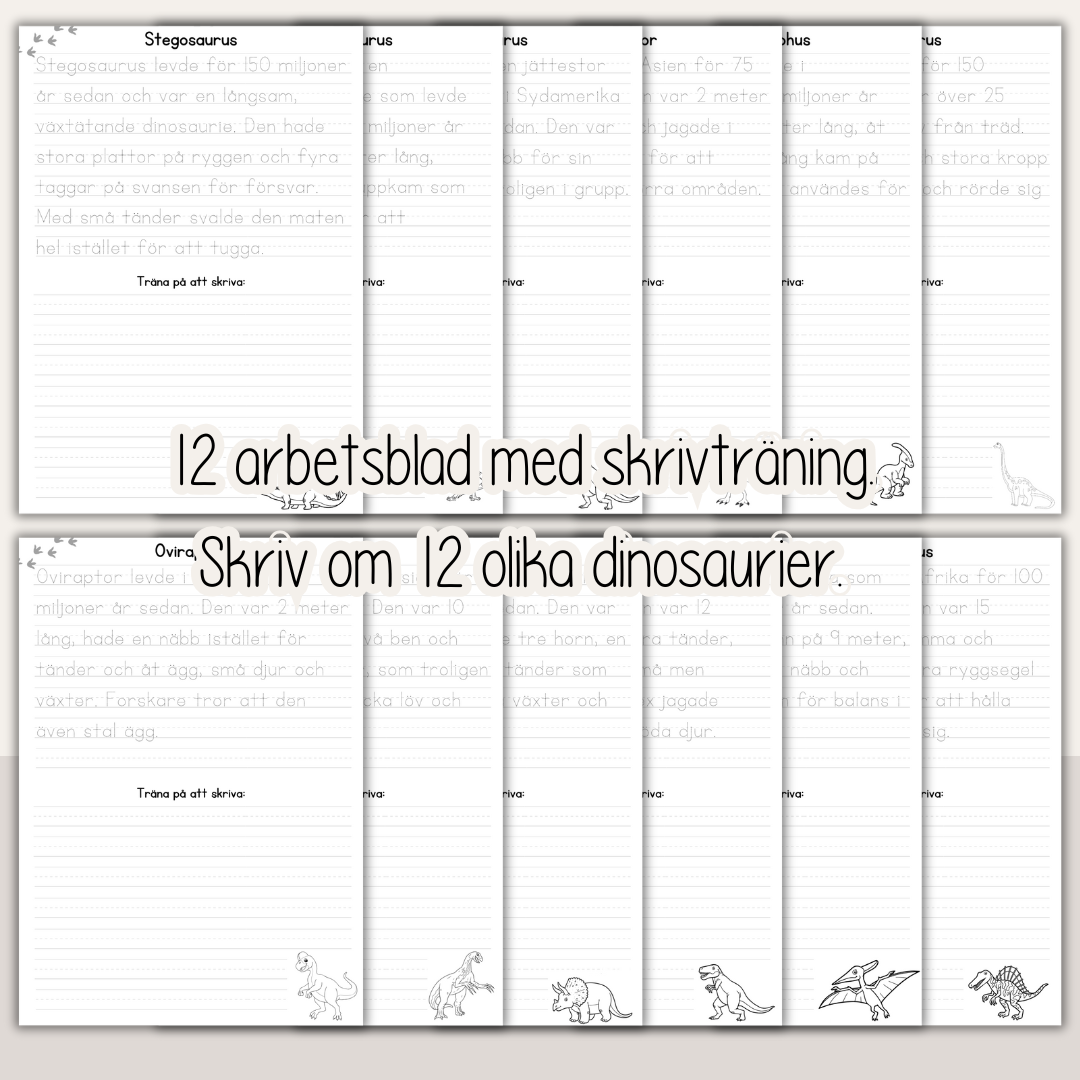 Träna på att skriva med dinosaurietema. 12 olika arbetsblad. Textrader med förtryckt text att spåra samt rader där man skriver på egen hand.