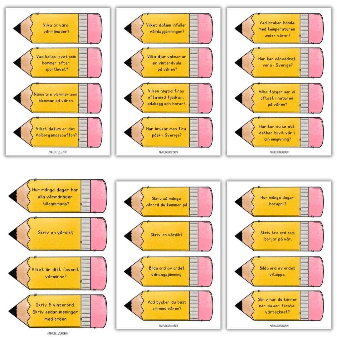 24 skrivuppdrag på pennor med tema -Våren. Ett roligt sätt att lära sig om våren samtidigt som de tränar på att skriva meningar.