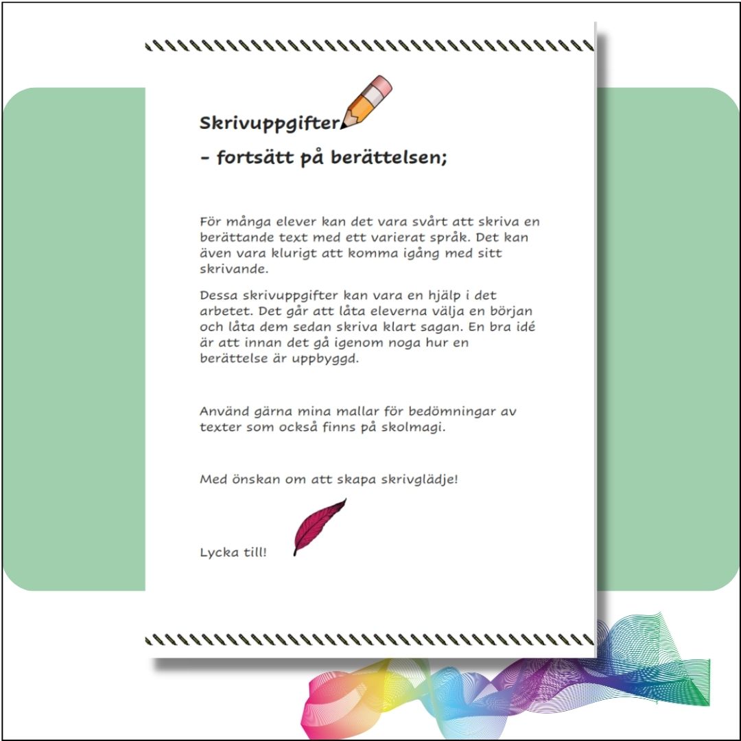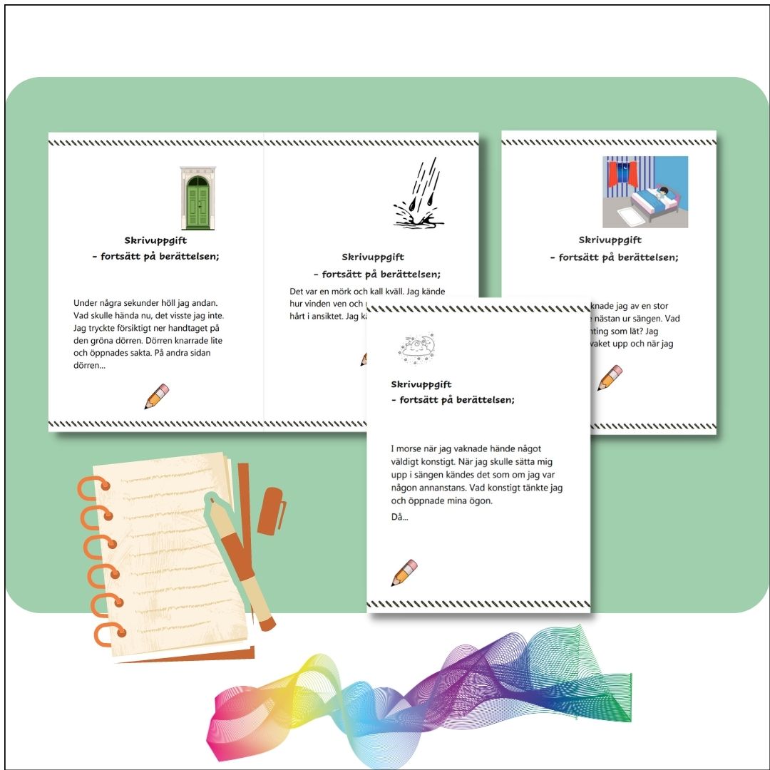 Dessa skrivuppgifter kan vara en hjälp i det arbetet. Det går att låta eleverna välja en början och låta dem sedan