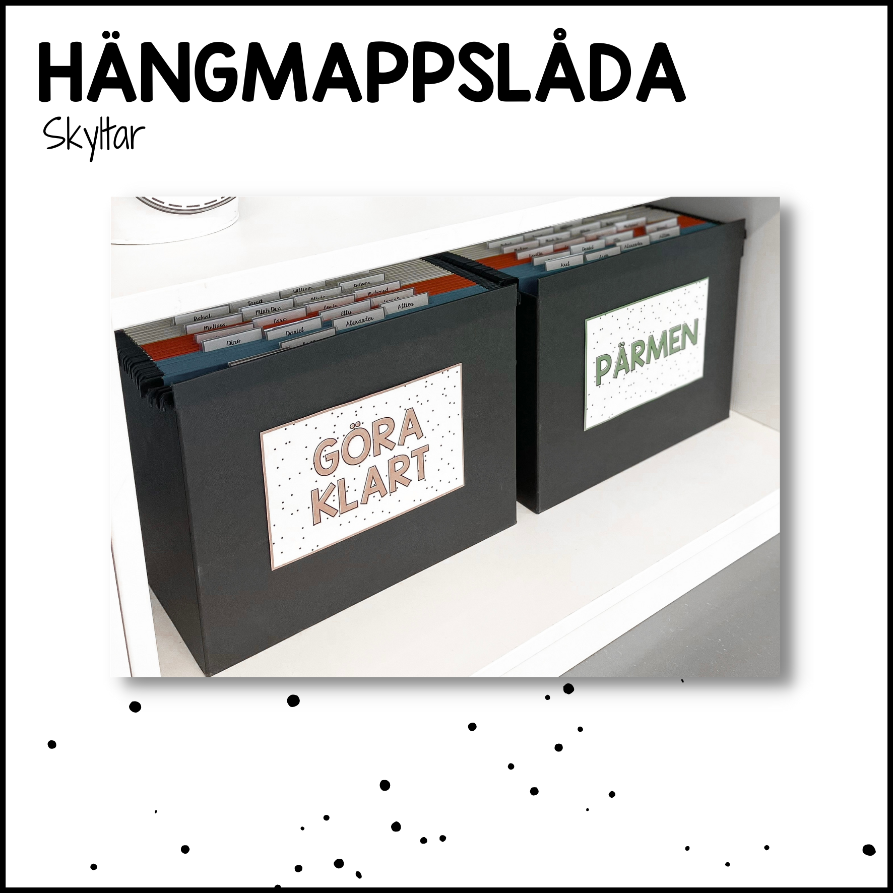 Skyltar ”göra klart” och ”pärmen” till hängmappslådor från officedepot. Jag använder dessa dagligen och det underlättar SÅ mycket för både mig och eleverna.