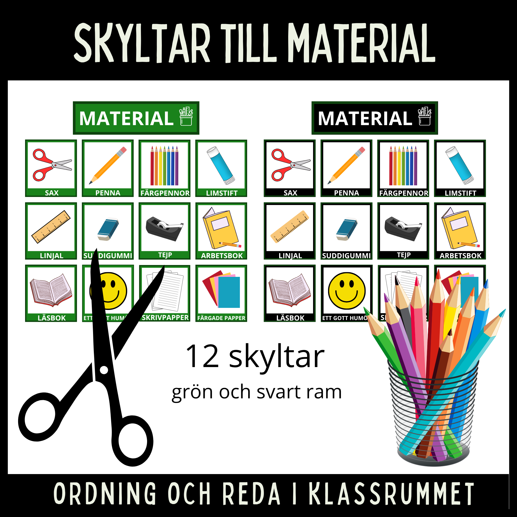 De här 2 filerna innehåller 12 tydliga skyltar med text och symbol för olika klassrumsmaterial som saxar, pennor, böcker m.m. Du får två uppsättningar, en med grön ram och en med svart ram, så att du kan välja den stil som passar bäst i ditt klassrum.
