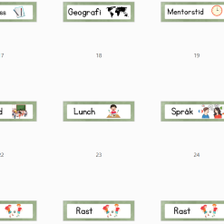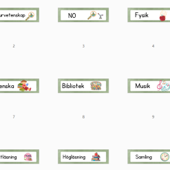 Biologi, naturvetenskap, NO, kemi, fysik, biologi, teknik, svenska, SVA, SO, samhällskunskap, religion, geografi, musik, idrott, slöjd, hemkunskap, målarbete, mentorstid, klassråd, utflykt, tystläsning, högläsning, bibliotek, engelska, samling, bild, arbetspass, språk, elevens val, rast.