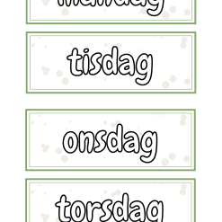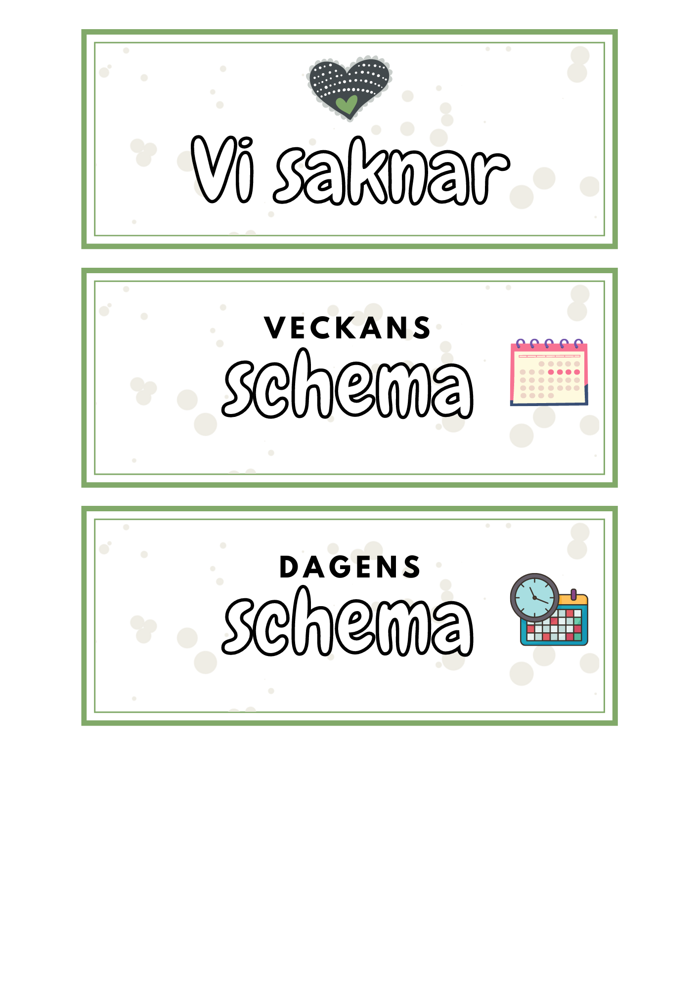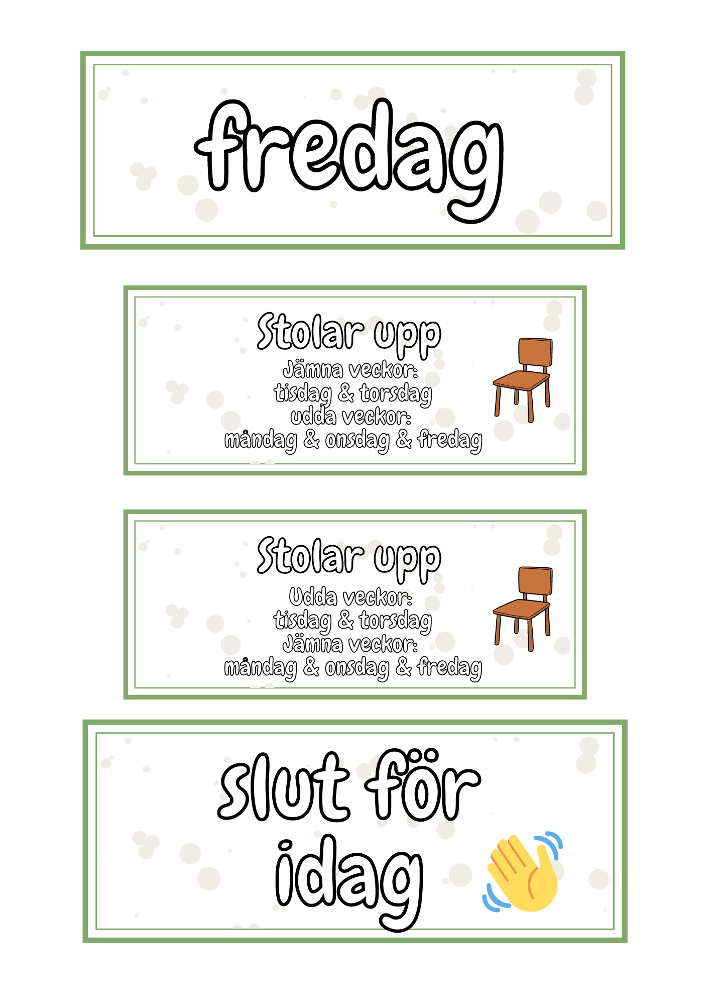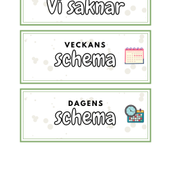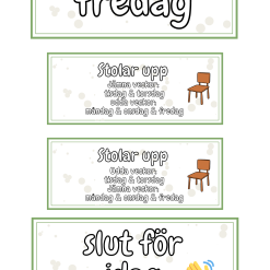 - Skyltar för: ”Vi saknar”, stolar upp, slut för idag, dagens datum, dagens schema och veckans schema