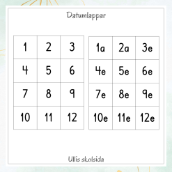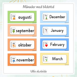Skyltar att ha till exempel på tavlan. Veckodagarna är färgkodade enligt SPSM rekommendation och månaderna/årstiderna enligt habiliteringens färgschema. Månaderna, årstiderna och en uppsättning av veckodagarna innehåller även bildstöd. En uppsättning av veckodagarna är endast färgkodade. Det finns även med datumlappar.