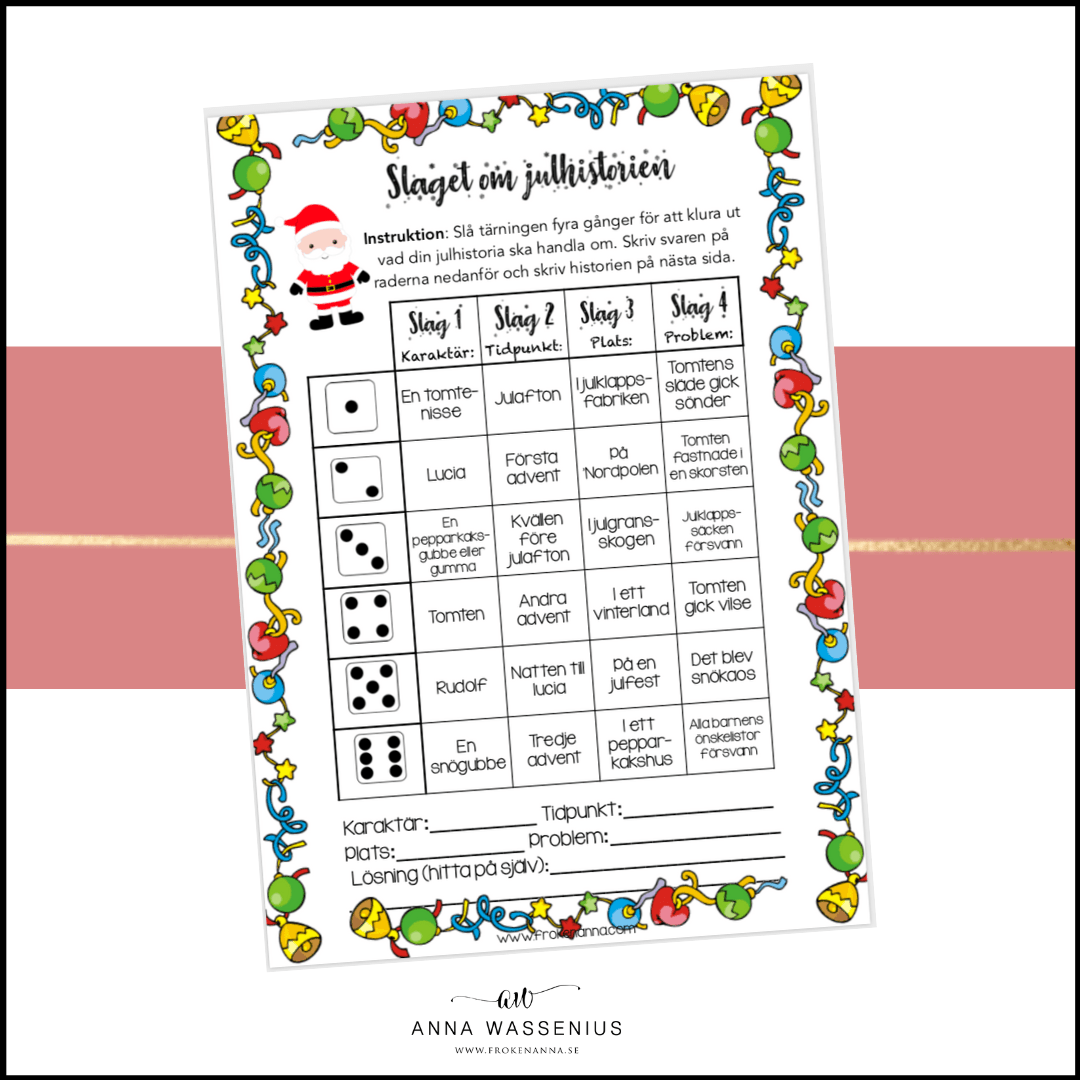 I detta kit ingår två A4 ”Slaget om julhistorien” samt två mallar att välja från att skriva historien på. Samma upplägg men två layouter, välj själv vilken du tycker bäst om. Lycka till!