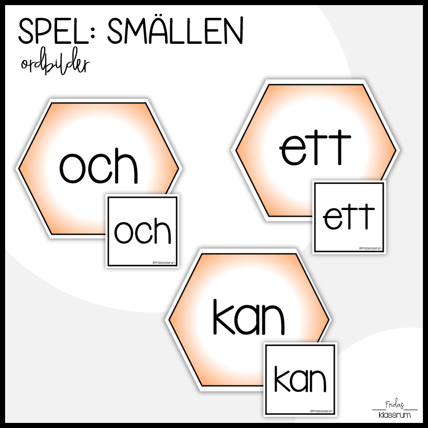 Spela ”Smällen”, använd materialet till en lektion utomhus eller använd hexagonerna som dekor i klassrummet för att synliggöra de högfrekventa orden.
