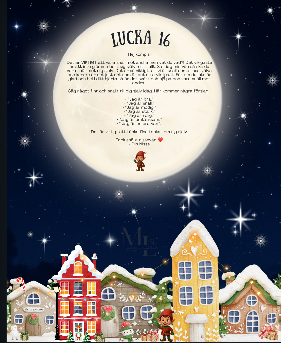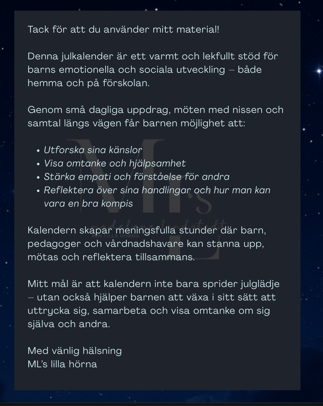 Att skapa 24 dagar fyllda av små handlingar och stora hjärtan. Att stärka barnens självkänsla, relationer och förmåga att förstå både sina egna och andras känslor. Och att ge en decembermånad som är lika varm som den är magisk.