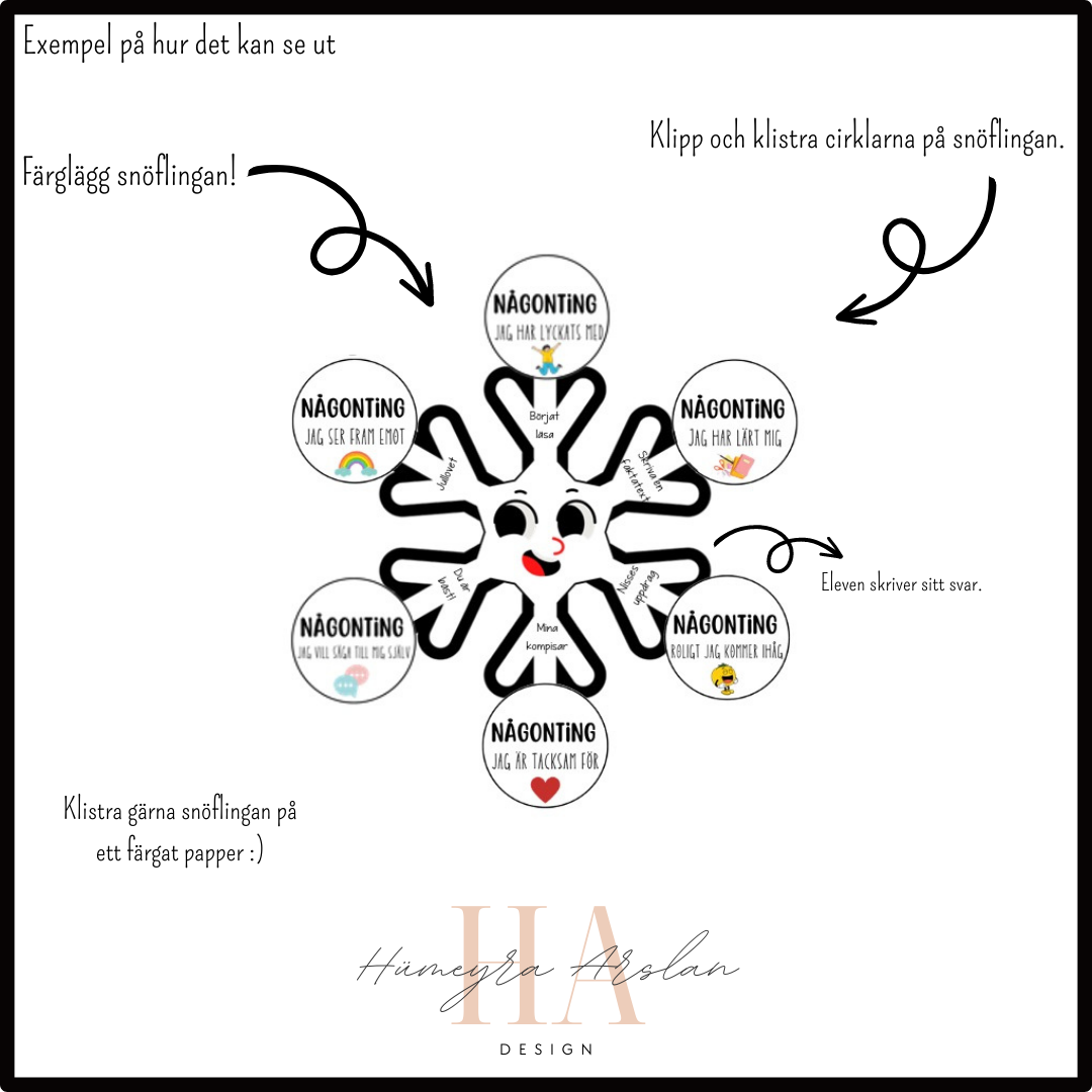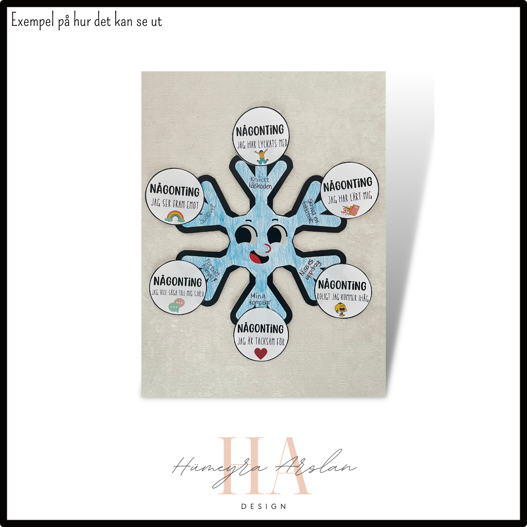 ”Snöflingan: Tack för denna termin!” är en uppgift som eleverna kan göra för att utvärdera terminen. Låt eleverna gärna färglägga snöflingan och cirklarna för att få en färgglad touch. Klistra sedan snöflingan på ett färgat papper.