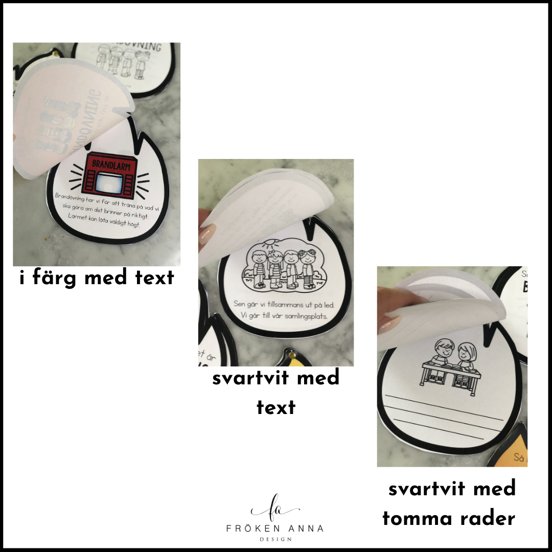 I detta material, som finns i tre nivåer, får eleverna läsa, skriva och färglägga hela förloppet genom en kreativ social berättelse i en brandbok. Materialet finns i färg och svartvitt med och utan text beroende på elevens förmåga.
