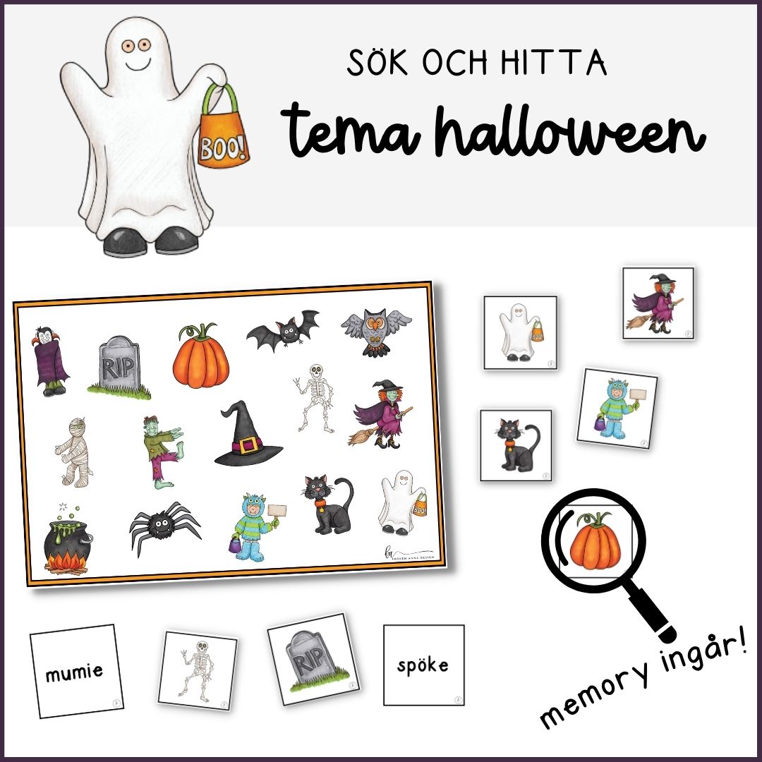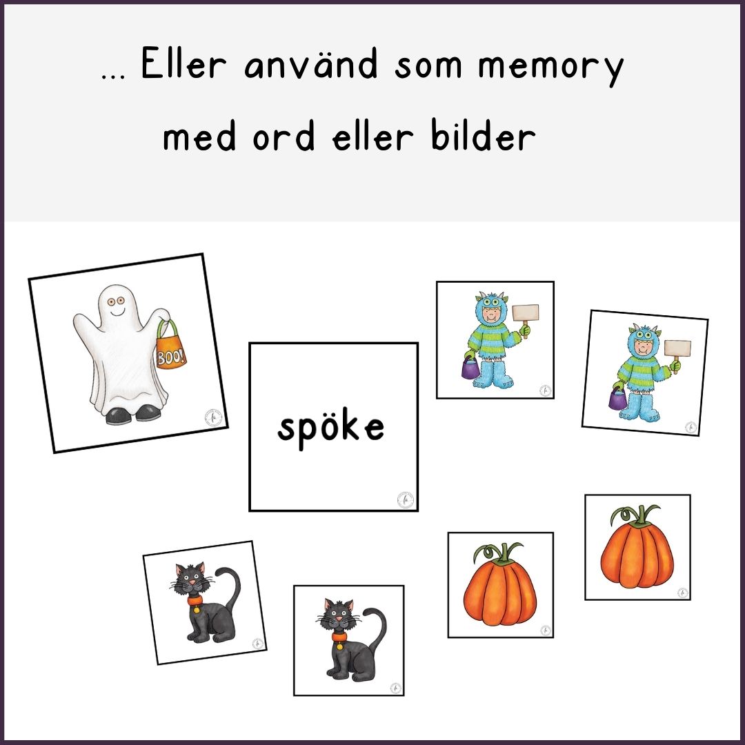 Skriv ut brickan och halloweenorden. Låt barnen hitta orden på brickan med hjälp av ord- eller bildkorten (beroende på barnets läsförmåga). Korten kan även användas som memory om ni skriver ut dubbletter eller användas för att matcha ord och bild eller bara bild med bild.