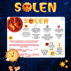 Fakta om solen, klipp och klistra, läsförståelse, skriva, spåra, lucktext, färglägg, placera solen rätt, finn fem fel, skriv vad du lärt dig, elevnära skrivuppgift om livet på Jorden utan solen. Målarbild. Facit medföljer till de uppgifter där det kan behövas.