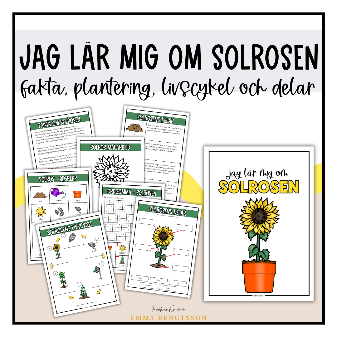 Materialet innehåller fakta och arbetsblad som passar bra om ni ska arbeta med solrosen, blommans livscykel eller blommans delar. Perfekt arbetsområde under våren!