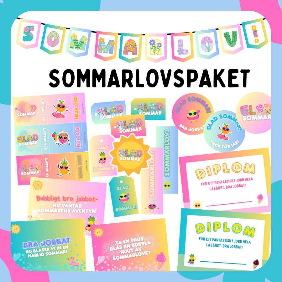 Ett färgglatt sommarpaket till skolavslutning med elever. Innehåller både fina dekorationer till klassrummet som roliga tillbehör till elevpresenter. Kitet innehåller: