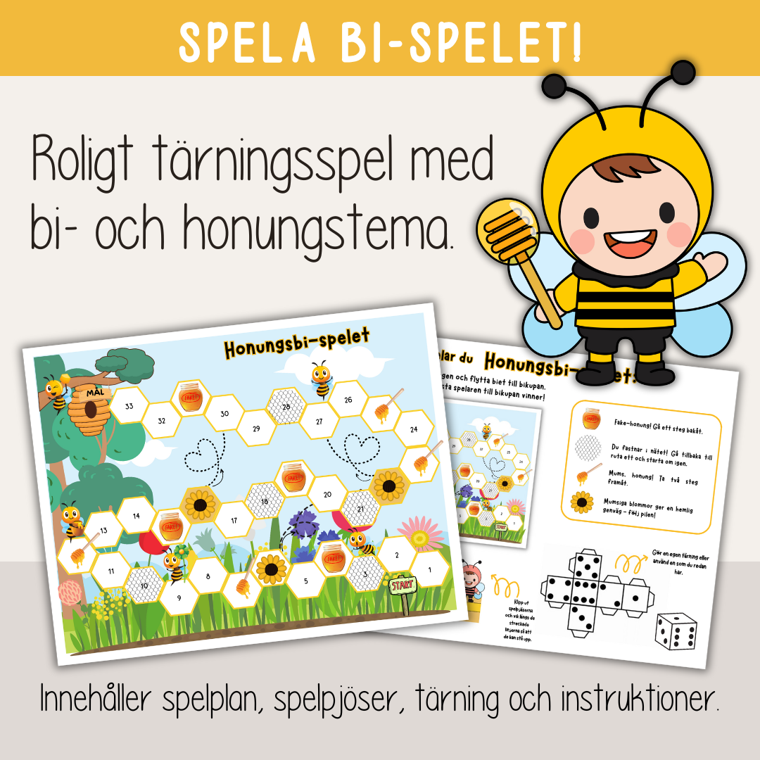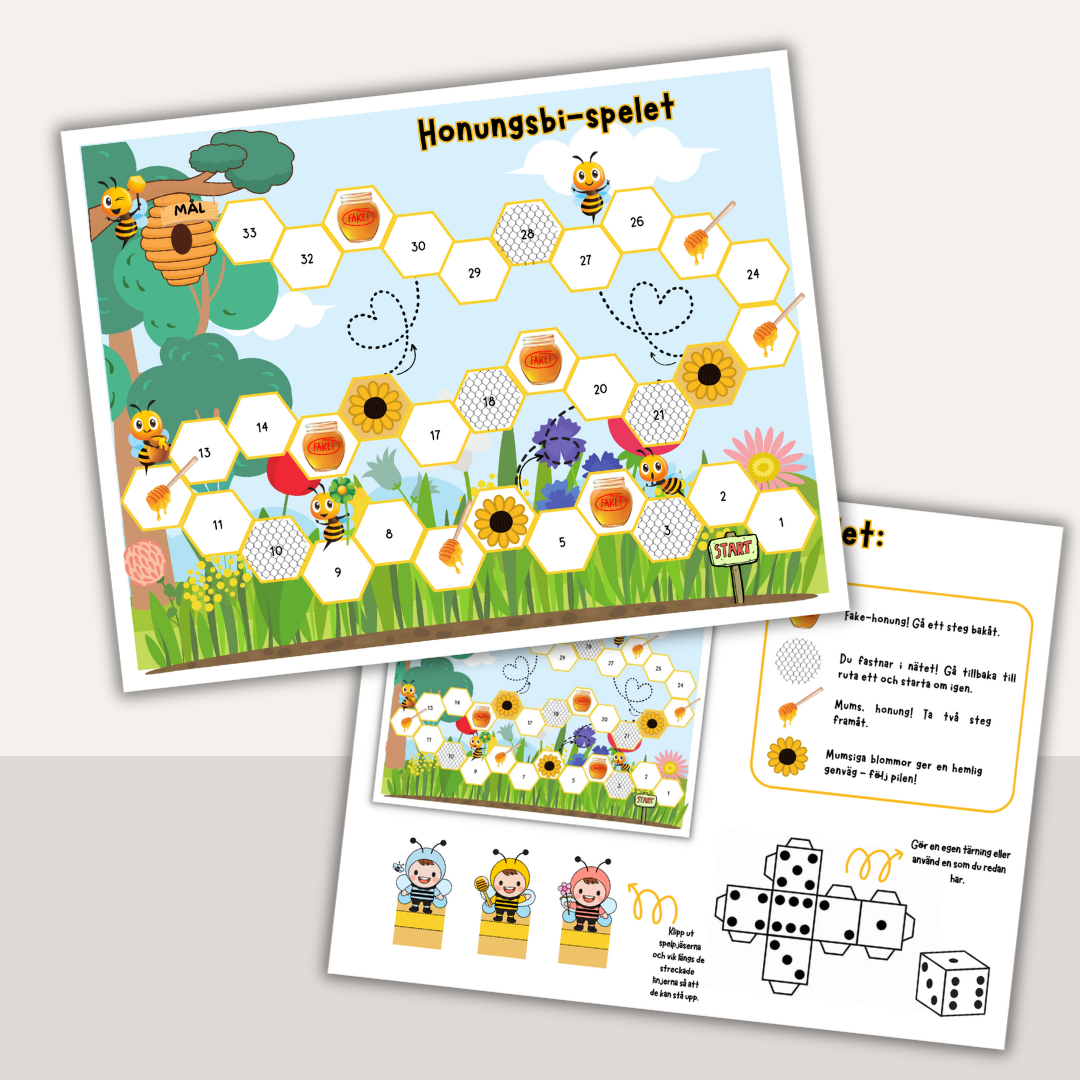 Ett roligt tärningsspel med tema bin och honung. Materialet innehåller allt du behöver – spelplan, spelpjäser, tärning och instruktioner. Skriv gärna ut på ett kraftigare papper för bäst resultat.