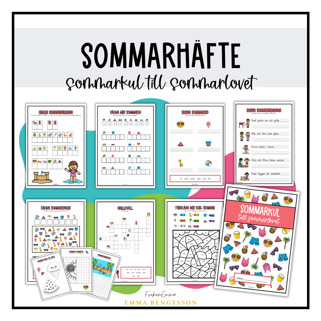 Skicka hem en liten sommarpresent när eleverna går på sommarlov! Detta arbetshäfte passar de yngre eleverna. Häftet har temat sommarlov och här får eleverna bland annat träna på handstil, skriva, stava, räkna, rita och läsa på ett lättsamt sätt. Syftet med häftet är att eleverna ska hålla igång med att läsa, skriva och räkna under sommaren. Alternativt kan du skriva ut och låta eleverna arbeta med arbetshäftet innan eller efter sommarlovet. Häftet innehåller 25 sidor, inklusive försättsblad. Se innehåll nedan: