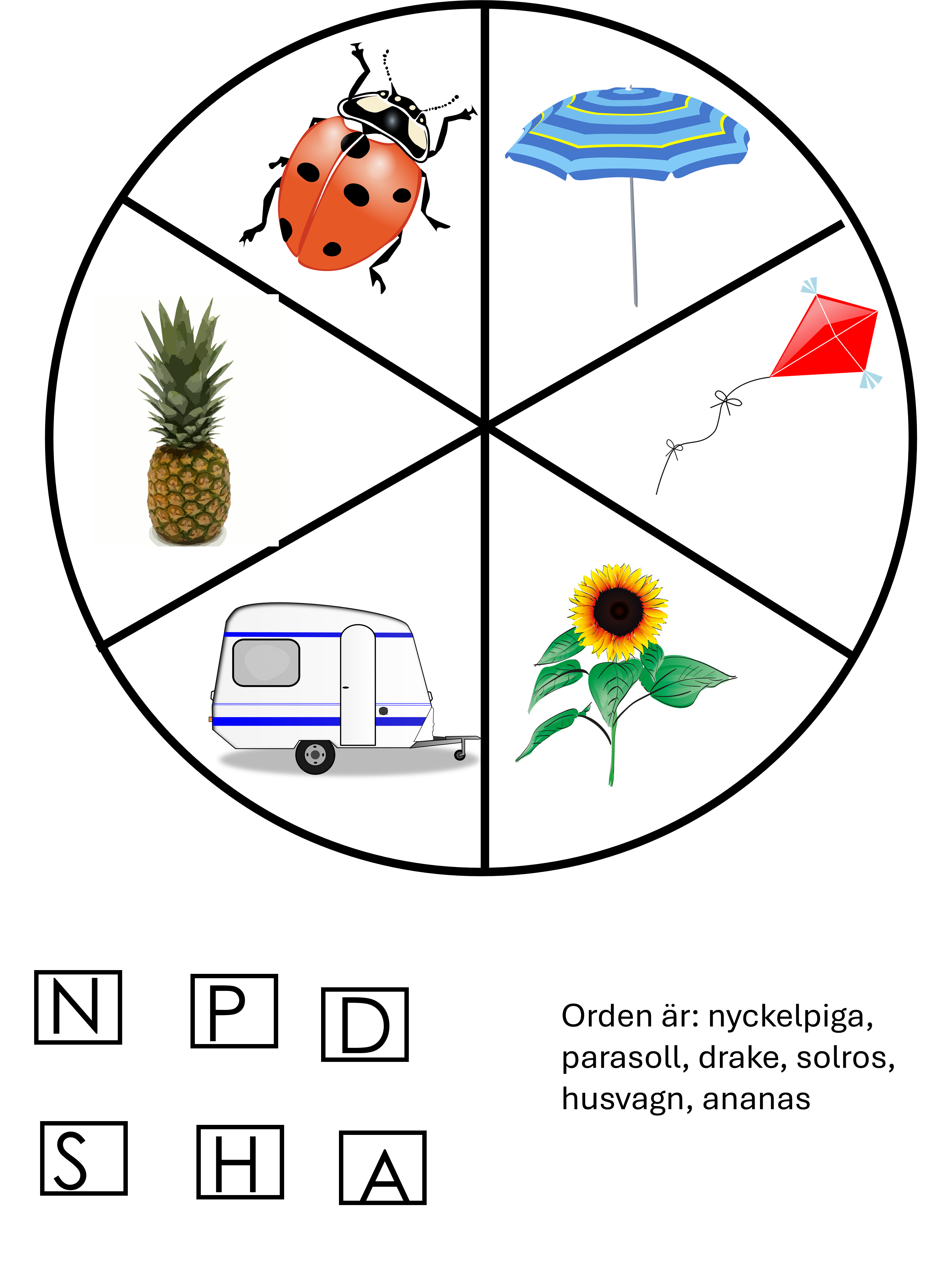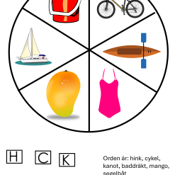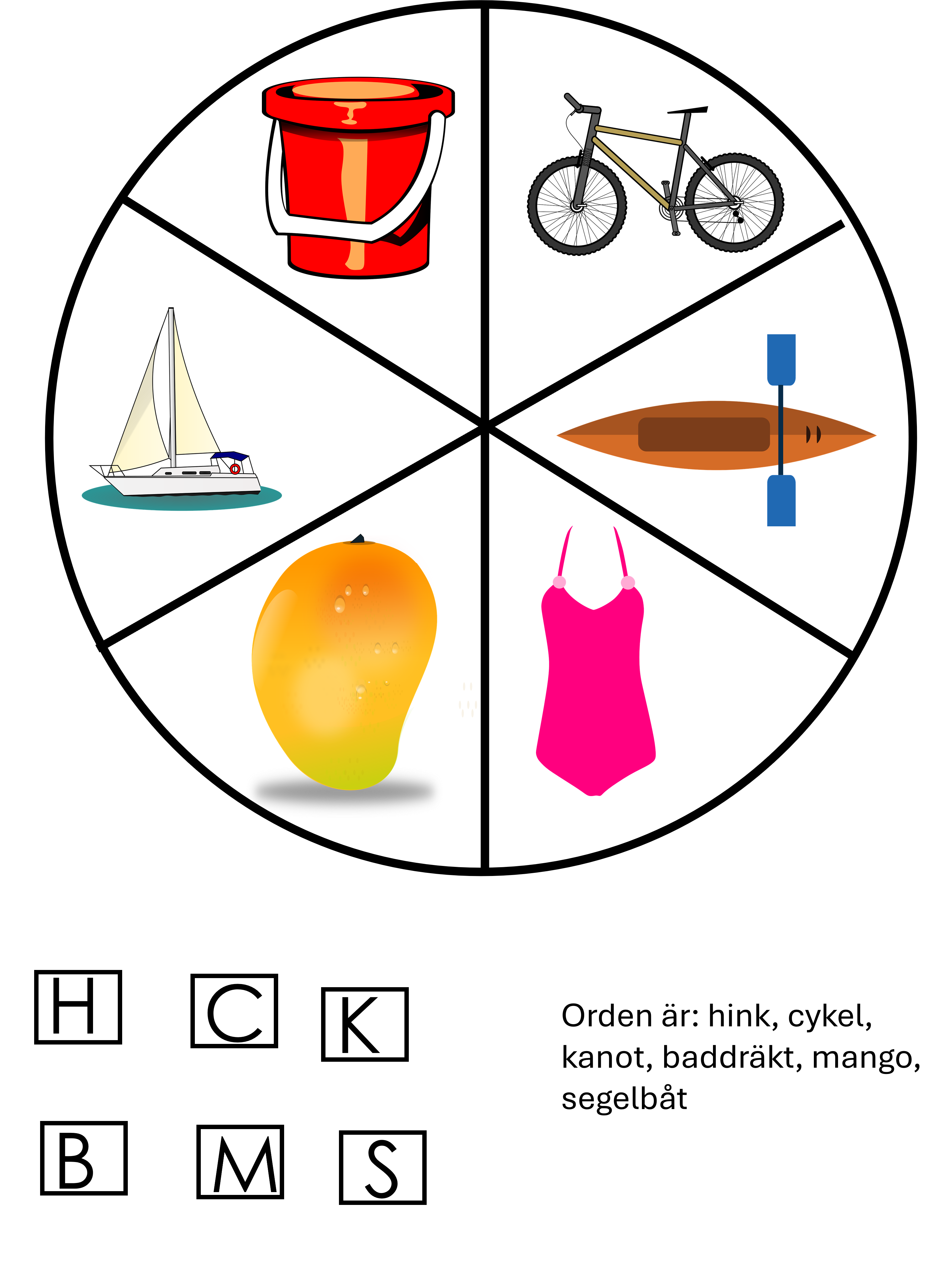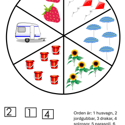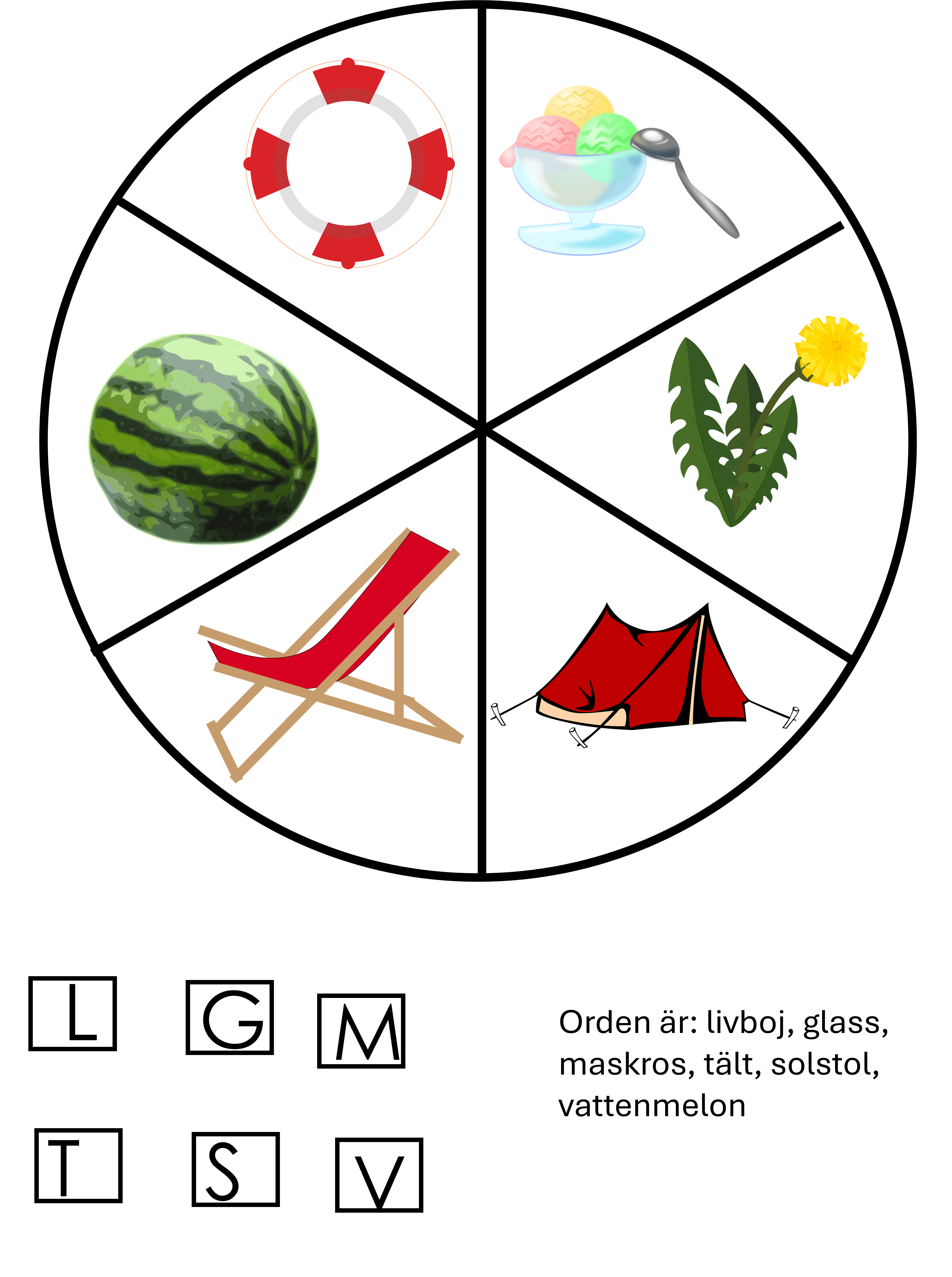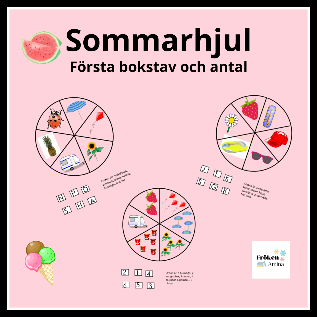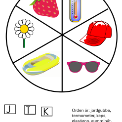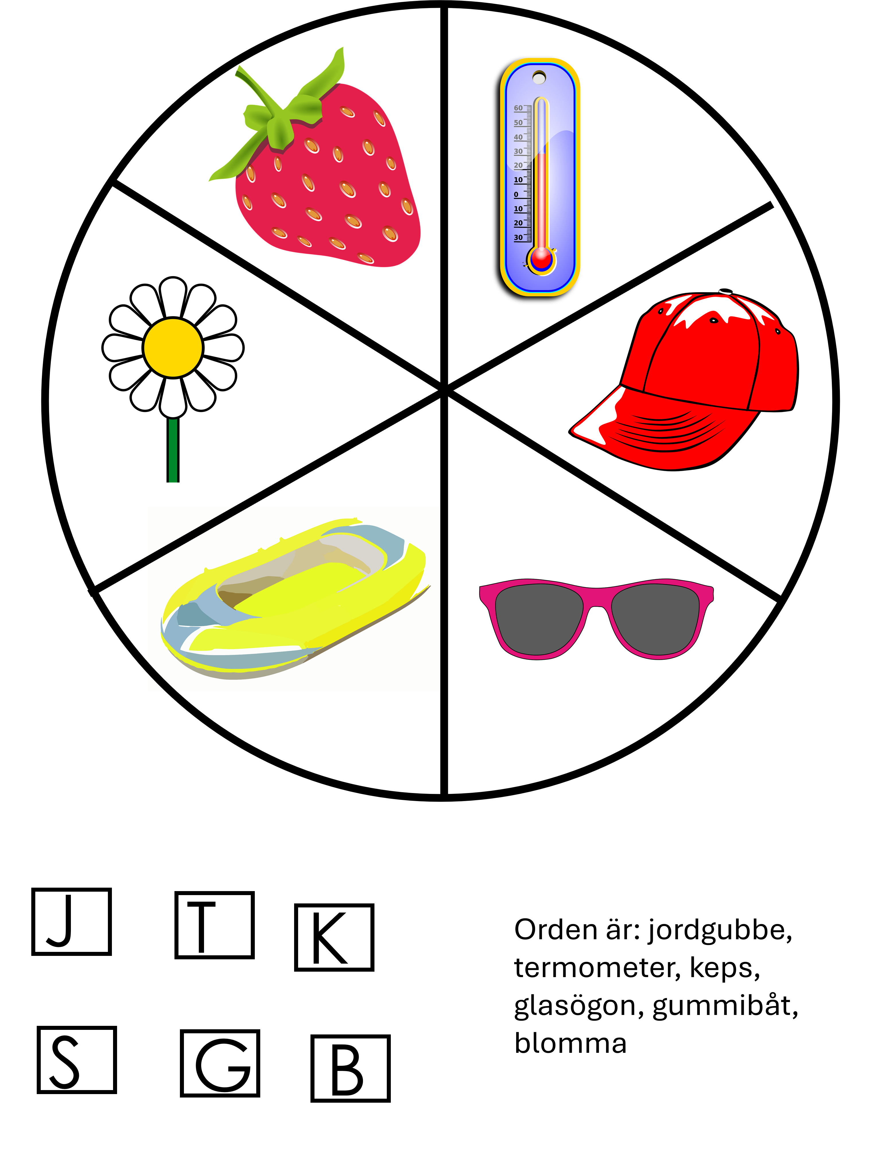 Materialet innehåller 7 hjul med bilder på saker som har med sommar att göra. Samt små lappar med bokstäver/siffror som du klistrar på klädnypor.