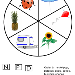 Materialet tränar på första ljudet i orden, det andra hjulet ska barnet räkna och sätta rätt siffra på rätt plats.