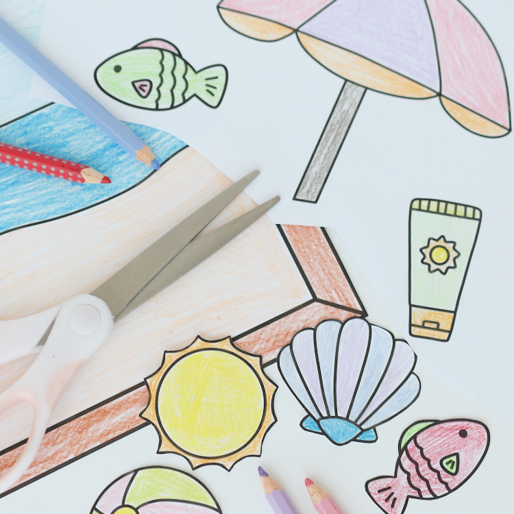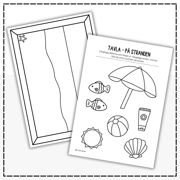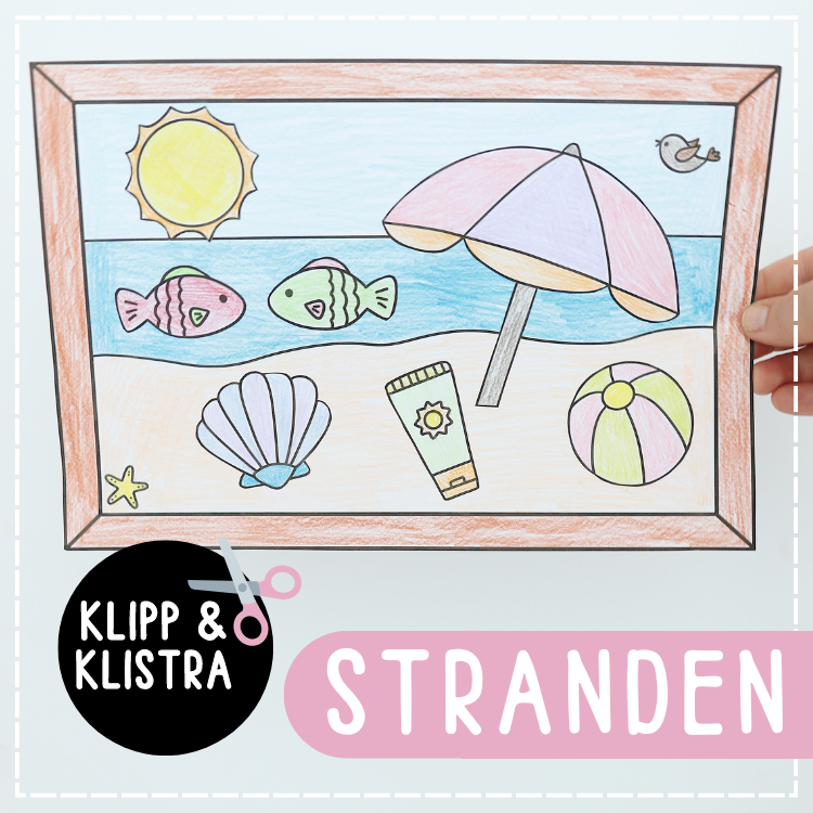 Pyssla en tavla med en strand i sommar. Färglägg, klipp och limma fast de olika motiven på tavlan.