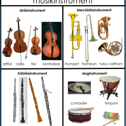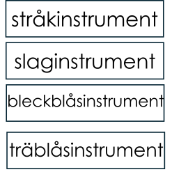 Materialet är ett material där barnet ska sortera instrumenten efter i vilken grupp de tillhör: stråkinstrument, träblåsinstrument, bleckblåsinstrument och slaginstrument. Korten är i 3 delar.