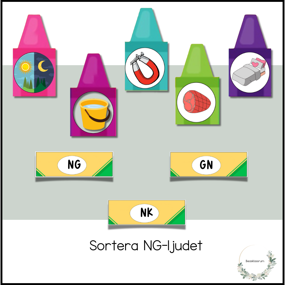 Eleverna får 3 stycken kritaskar (med sätten NG-ljudet stavas på) och ska därefter sortera in kritorna med bilder i rätt askar.