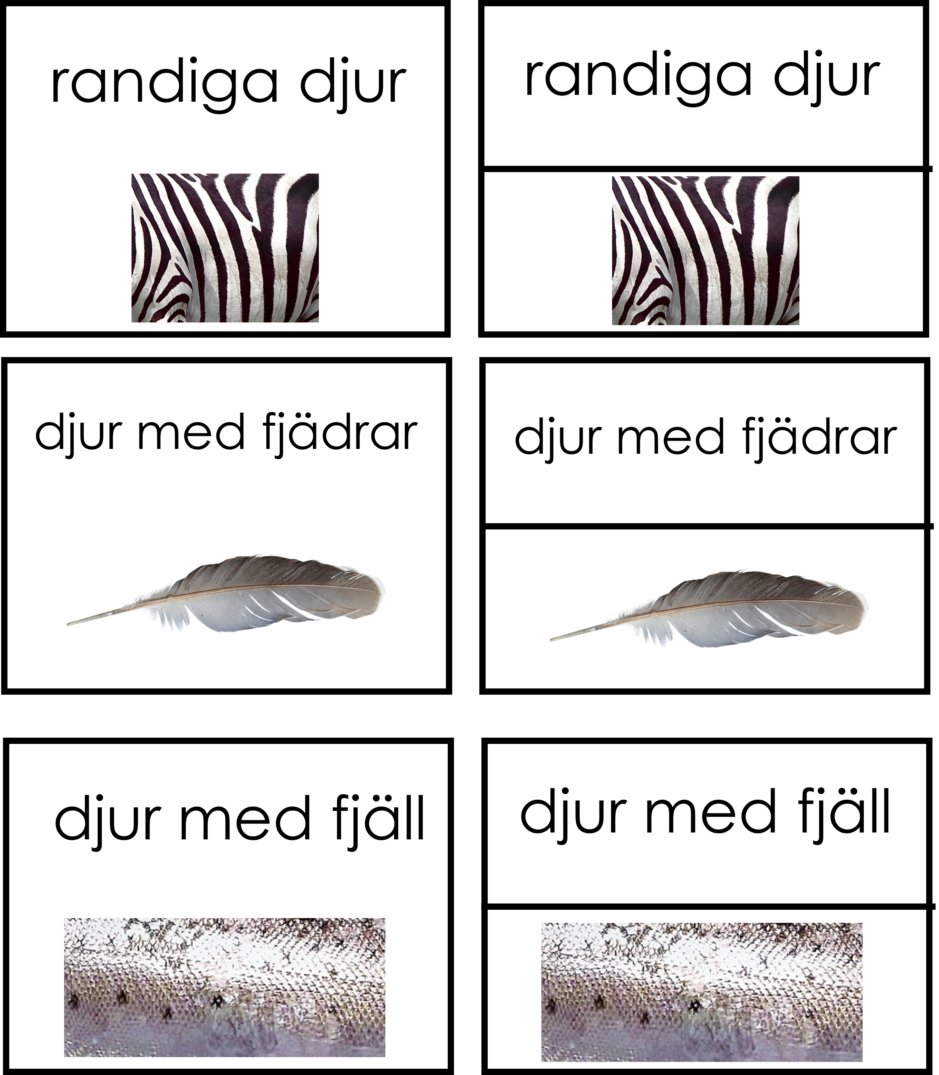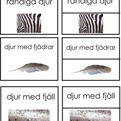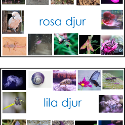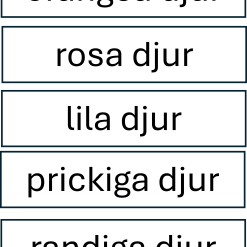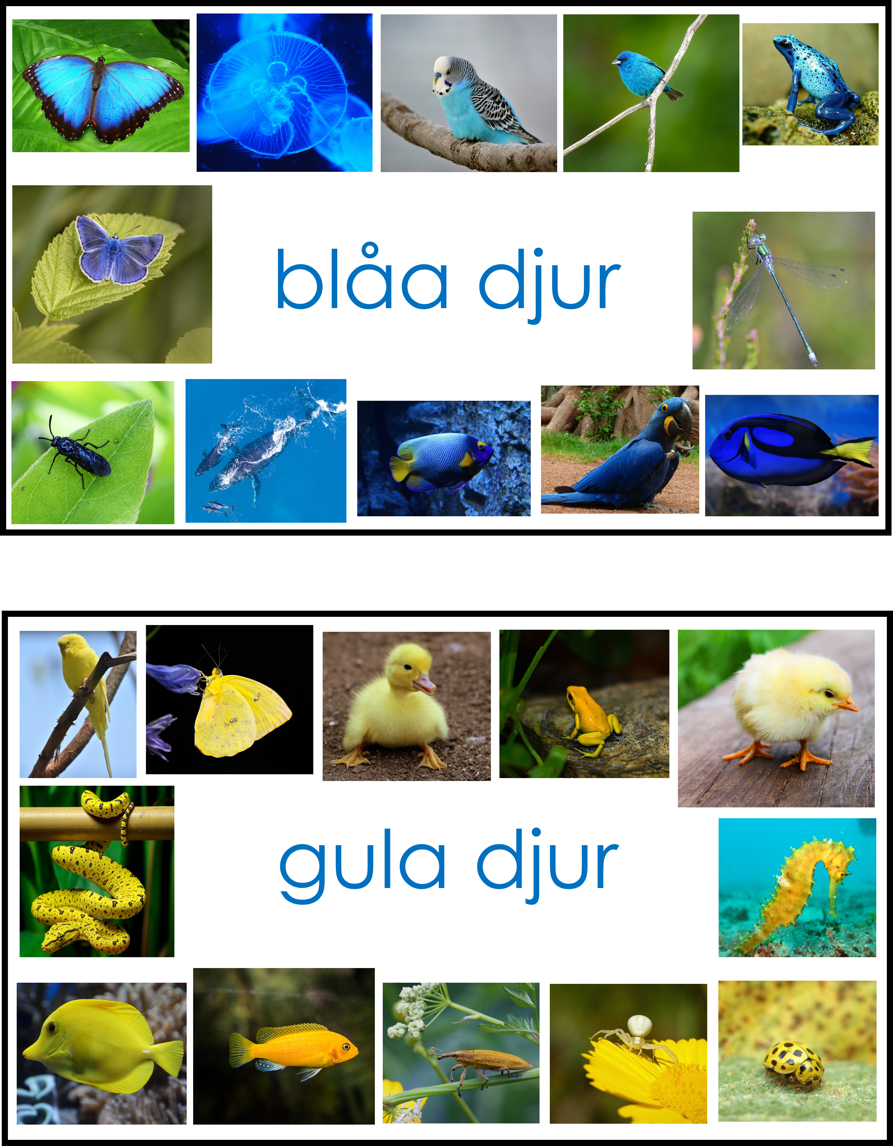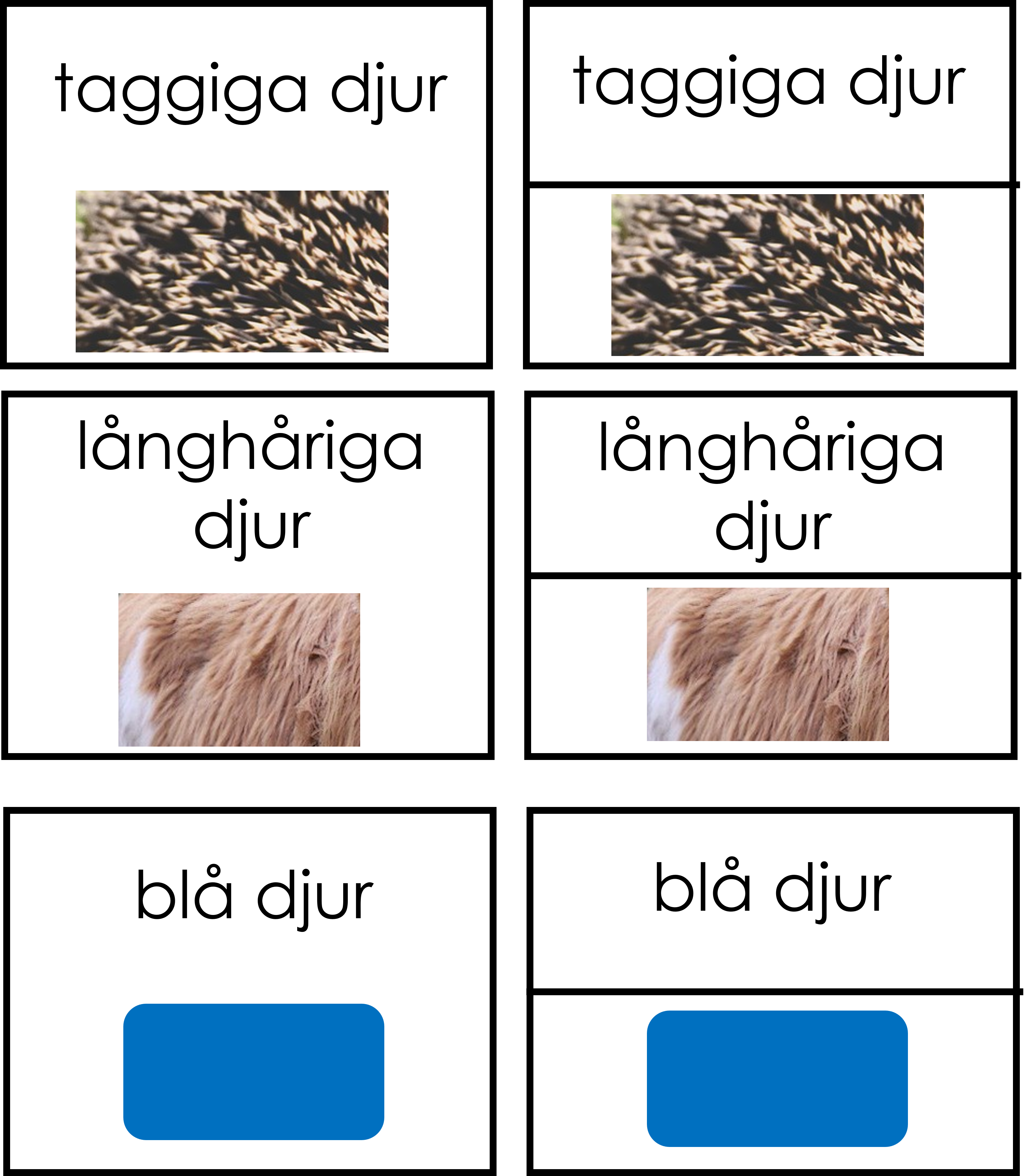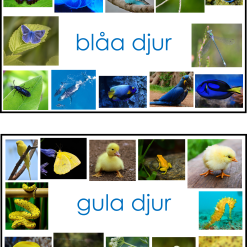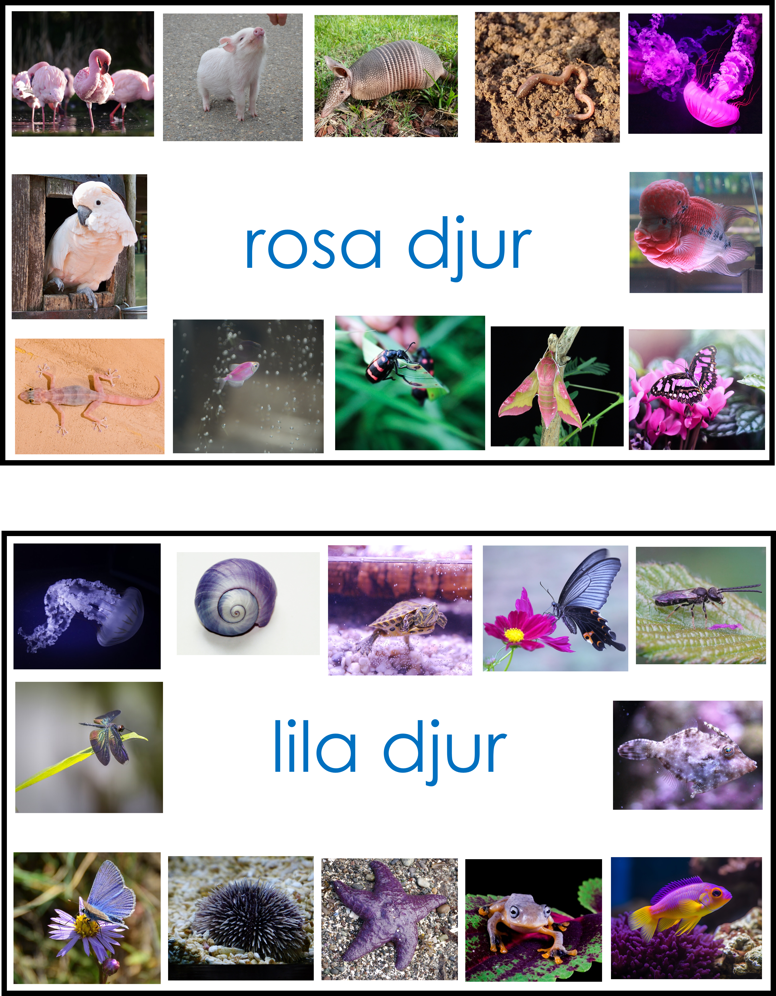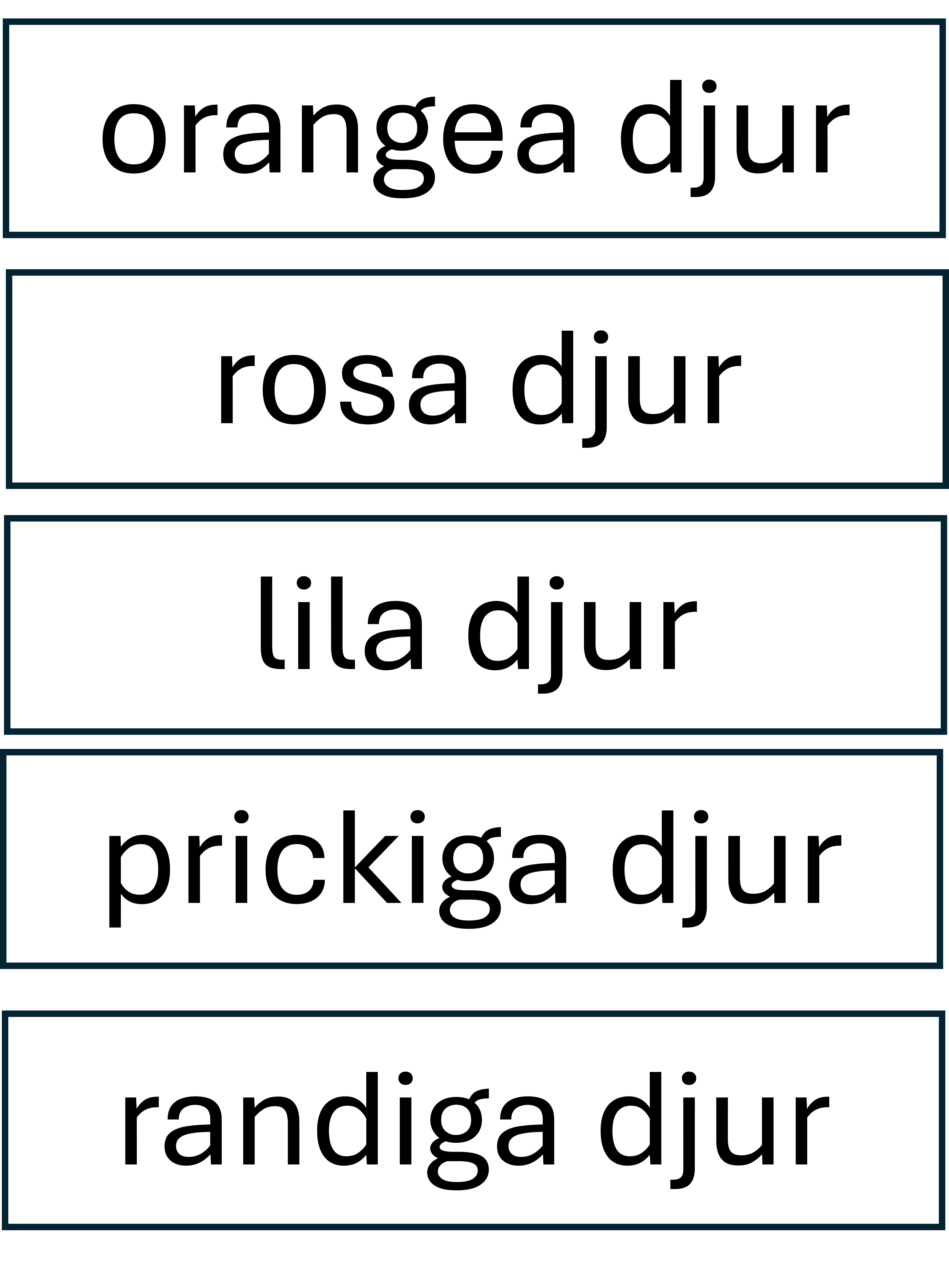 Materialet är sorteringskort till alla olika djurkort som jag har gjort. Djur som är gula, blå, lila, rosa, röda, orangea, prickiga, långhåriga, taggiga, randiga, djur med fjädrar och djur med fjäll