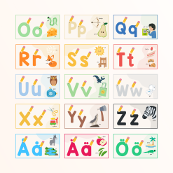 Interaktiv PowerPoint där eleverna får träna på att spåra bokstäver. Visa presentationen i helklass och låt eleverna härma rörelsen med fingret, på en miniwhiteboard eller med penna och papper.
