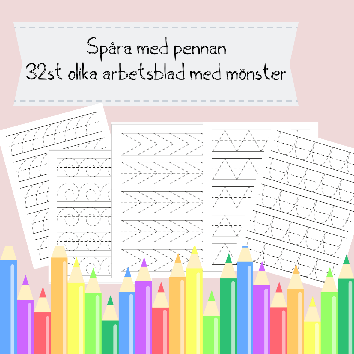 Träna penngreppet och finmotoriken med dessa arbetsblad! 32 sidor med olika mönster att följa efter med pennan.