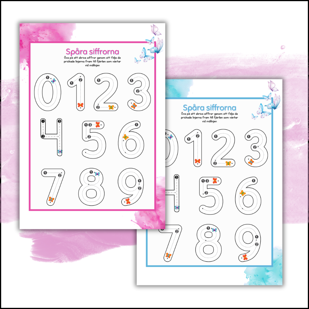 Spåra siffrorna 0-9. Två arbetsblad i blå och rosa