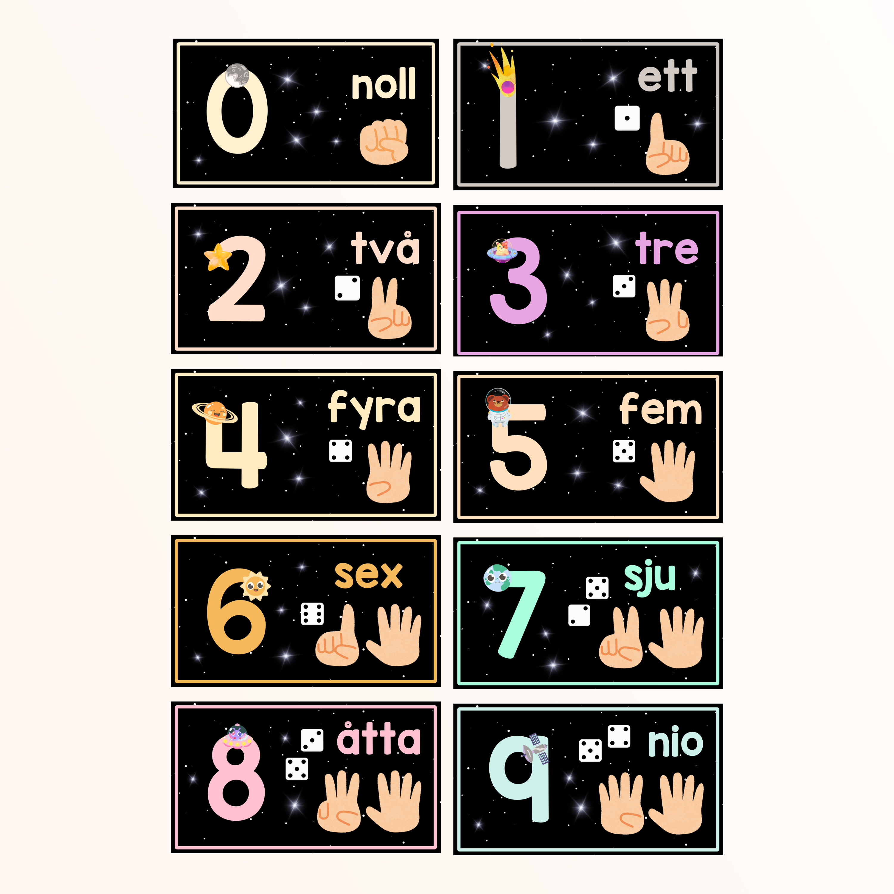 Det enda du som lärare behöver göra är att trycka på en knapp så visar olika rymd-figurer det korrekta formandet av samtliga siffror 0-9.