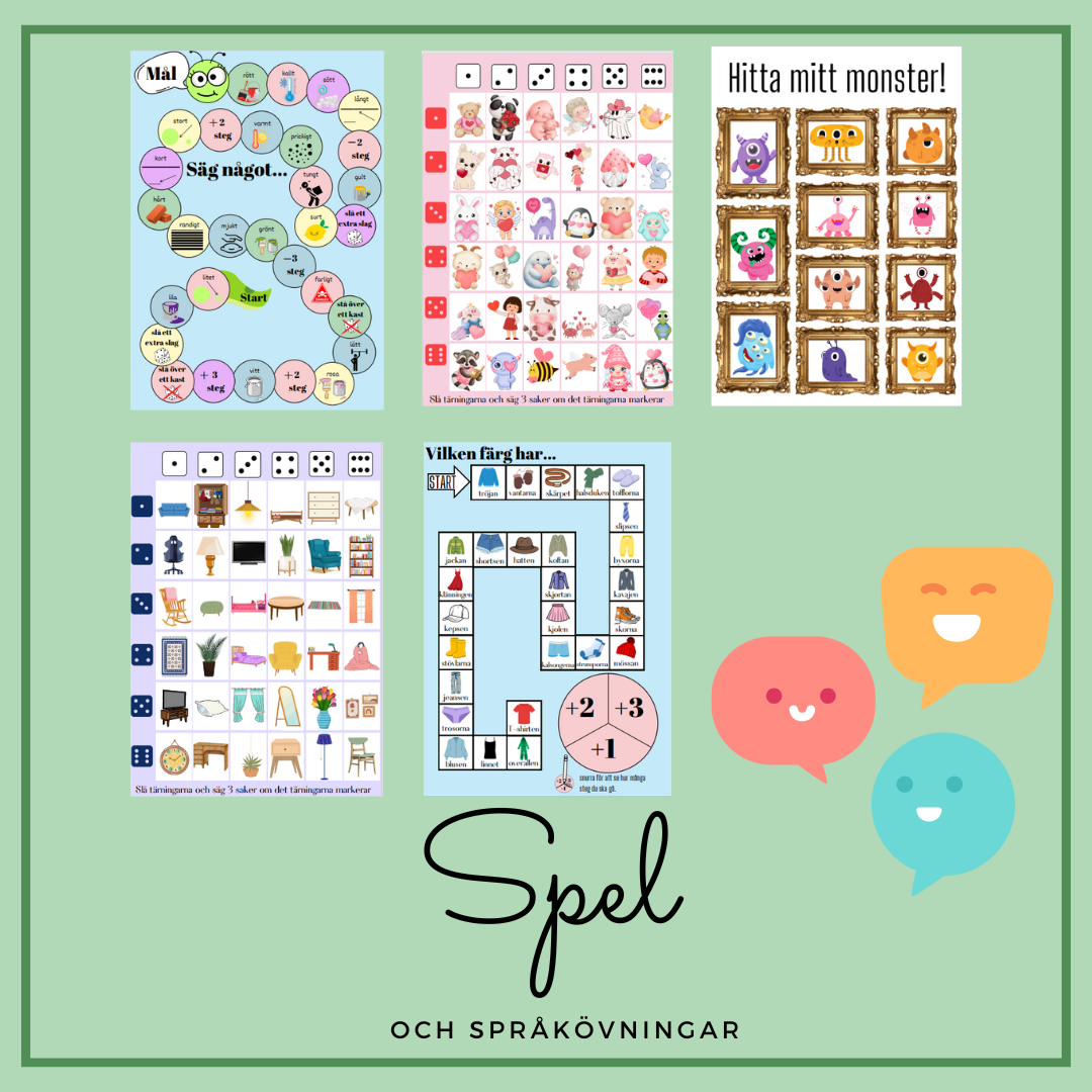 Övningar och spel som på ett lättsamt och roligt sätt tränar eleven i att tala och träna på nya ord.