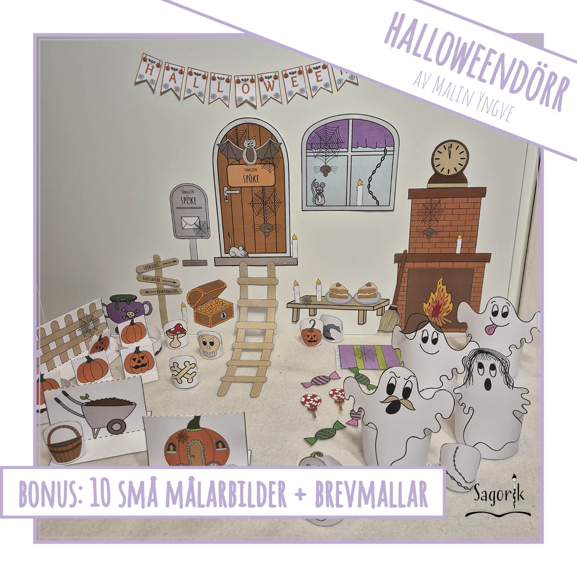 – Spökfamiljens dörr med tillhörande rekvisita – du får med både en version att färglägga själv och en som redan är färglagd