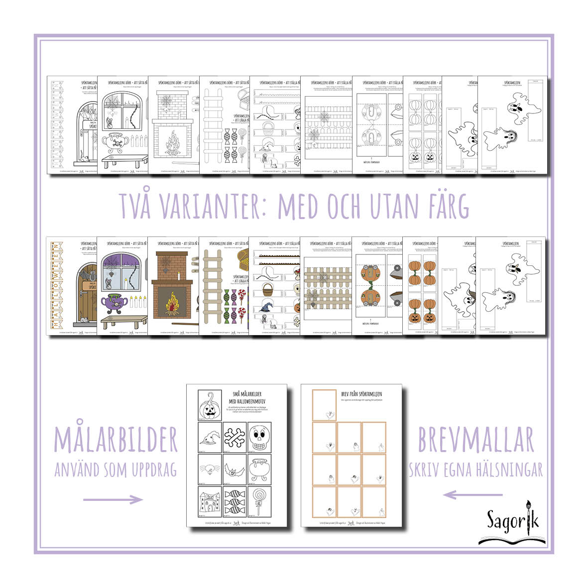 Använd spökfamiljens små målarbilder som uppdrag till barnen. Lägg en målarbild utanför dörren varje dag under höstlovet och låt barnen färglägga den som en present till spökena. Enklaste sättet att fixa en halloweenkalender/pysselkalender!