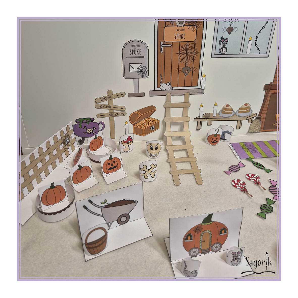 Du får även med fem spöken att leka med vid spökfamiljens dörr. Ta en tur i mössens pumpavagn, skörda pumpor i pumpaodlingen, eller fika på godis och pumpabakelser vid kaminen i vardagsrummet. En kreativ lek som varar hela höstlovet!
