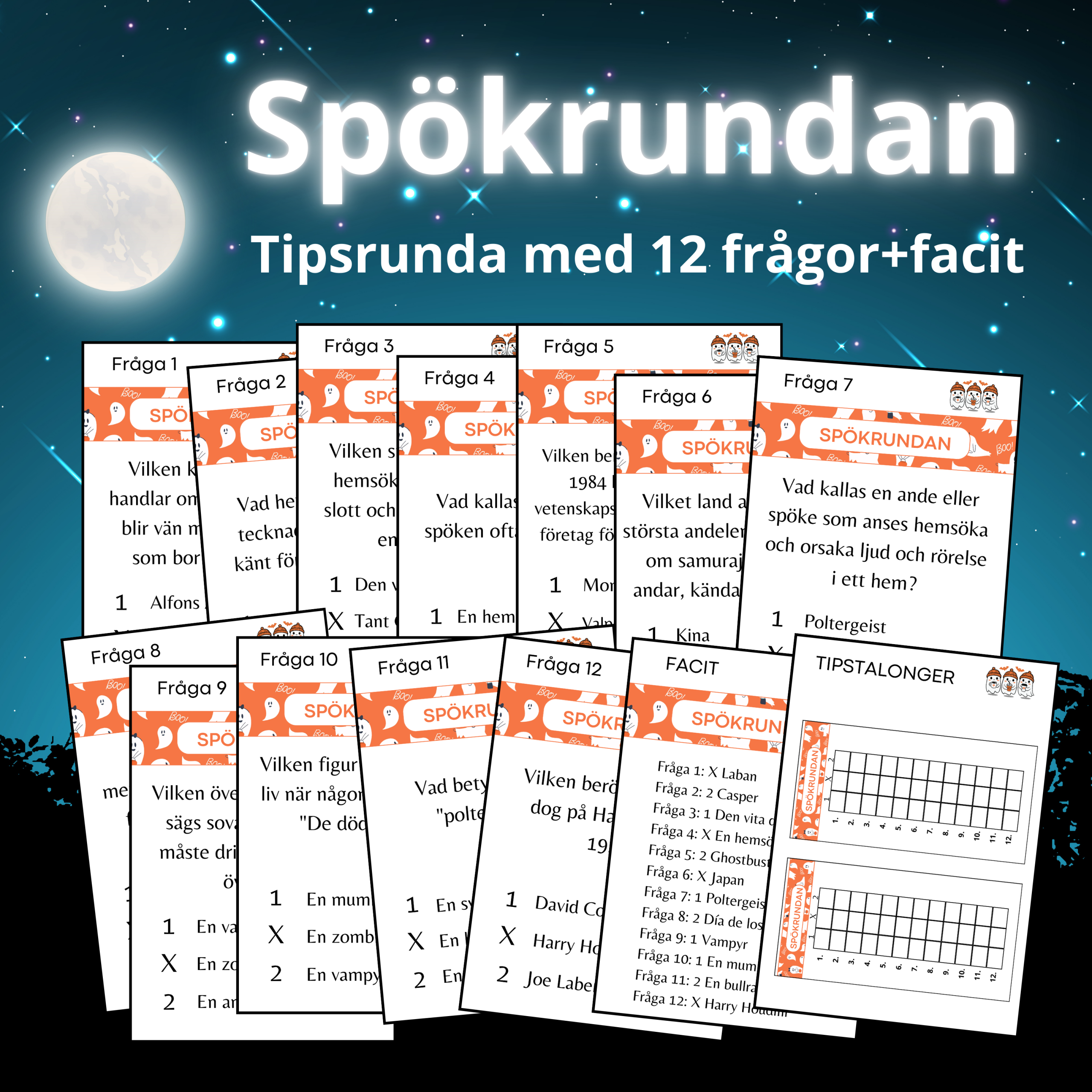 Spökrundan – tipspromenad med 12 frågor + facit. Blandade frågor som passar både yngre och äldre elever.