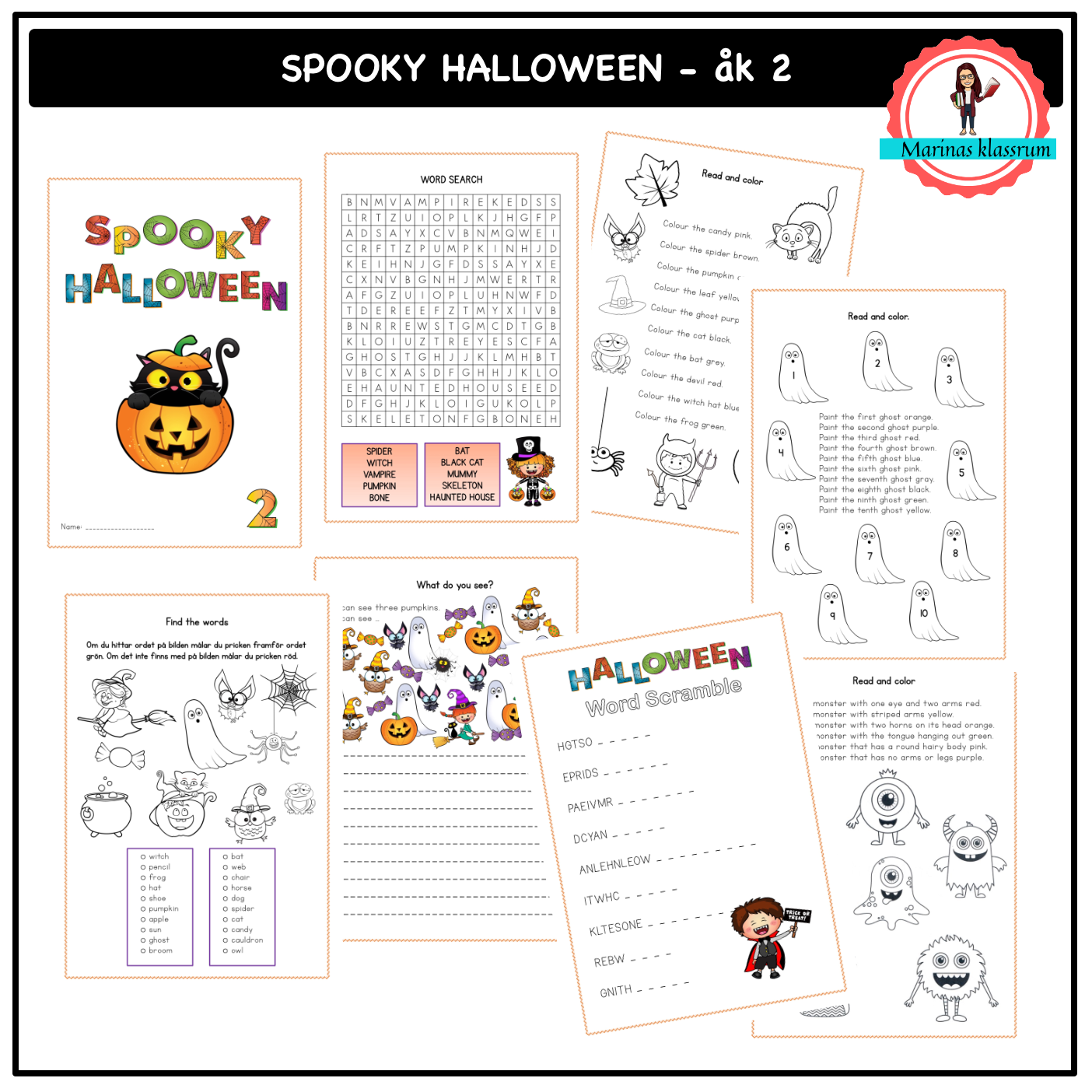Ett arbetshäfte med olika arbetsuppgifter som tränar elevernas förmåga att läsa och skriva på engelska med ett Halloween-tema.
