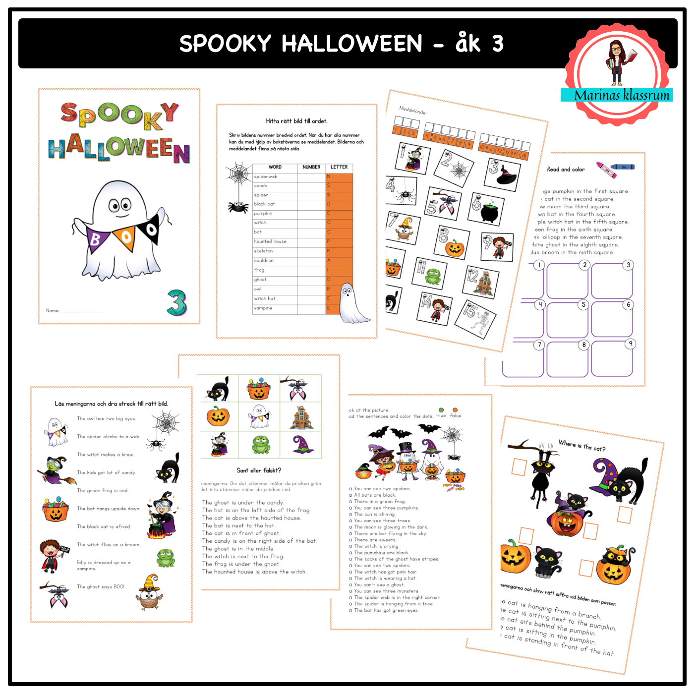 Ett arbetshäfte med olika arbetsuppgifter som tränar elevernas förmåga att läsa och skriva på engelska med ett Halloween-tema.
