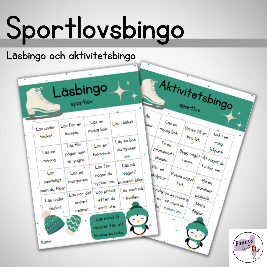 Aktivitetsbingo och läsbingo till sportlovet, perfekt att skriva ut på fram och baksida så att eleverna både får vara aktiva och ha mysiga lässtunder på sportlovet.
