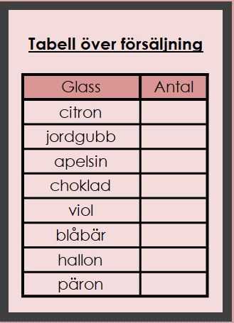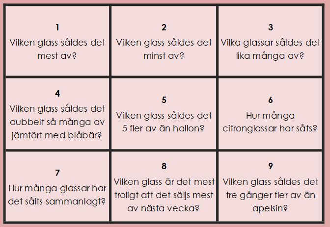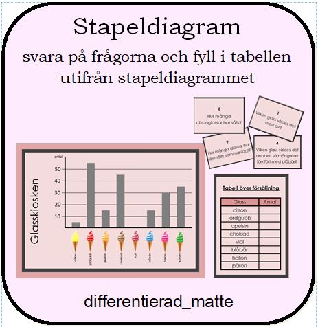 I grupp får eleverna ett stapeldiagram. De avläser stapeldiagrammet och fyller i tabellen. Sedan finns 9 frågor i stigande svårighetsgrad att svara på. Gruppen svarar på så många som passar dem i tid och i svårighetsgrad.