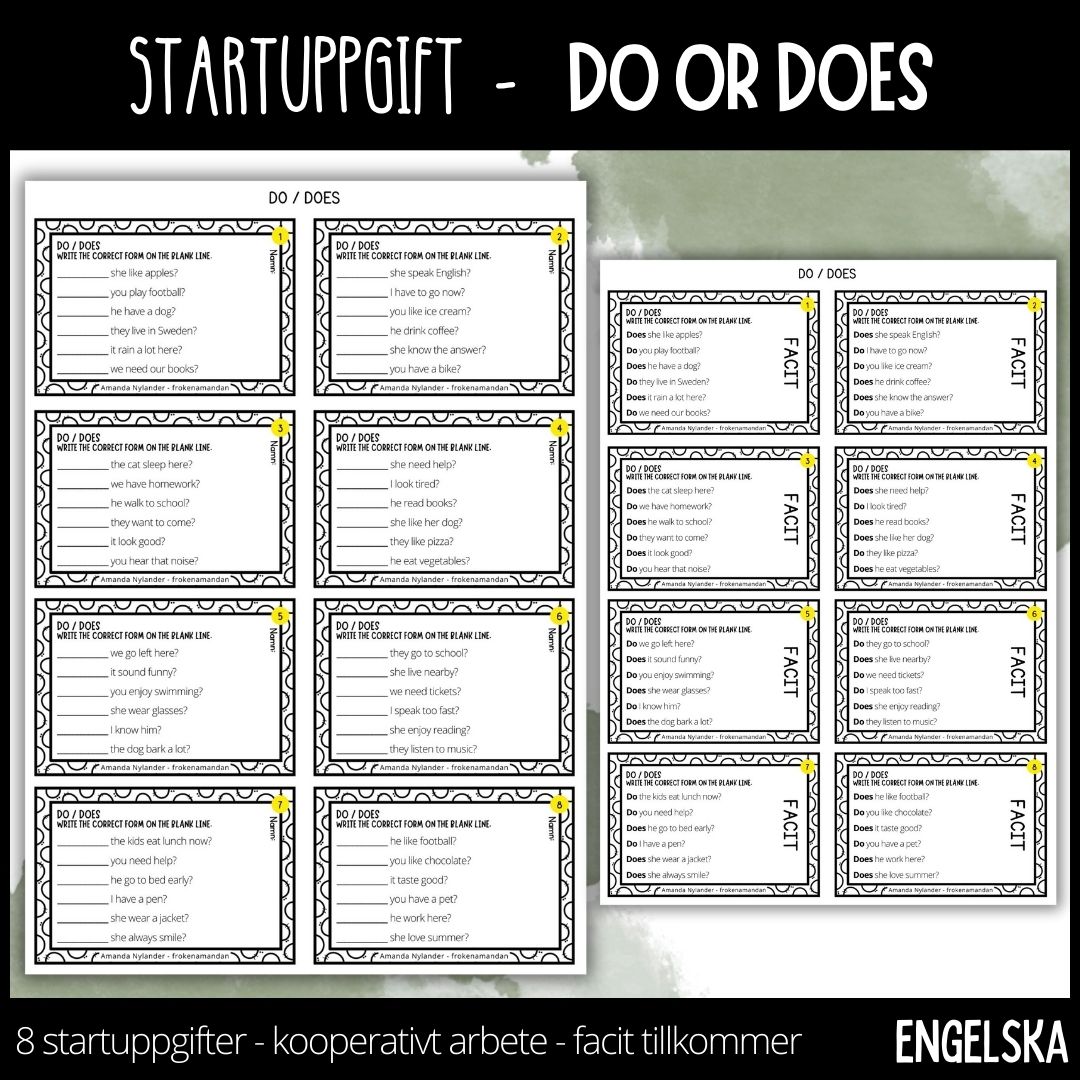 8 startuppgifter. Låt eleverna öva på do och does som startuppgift varje morgon / lektion tillsammans med varandra eller som exitticket för avstämning. Låt de elever som blir färdiga innan tiden är slut färglägga ramen i en snygg färg. Facit tillkommer.