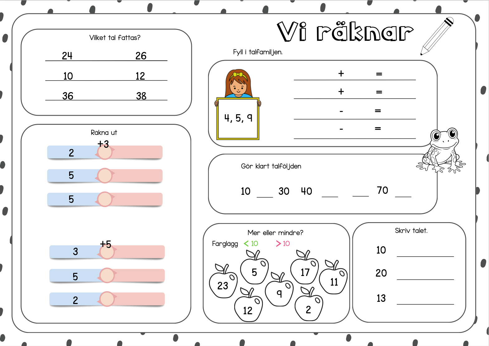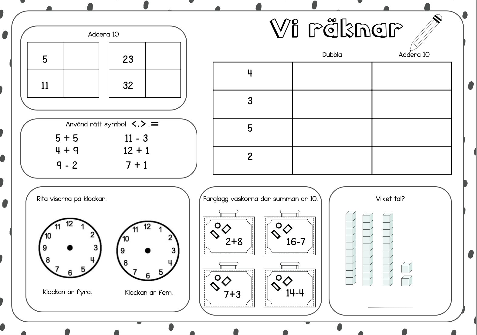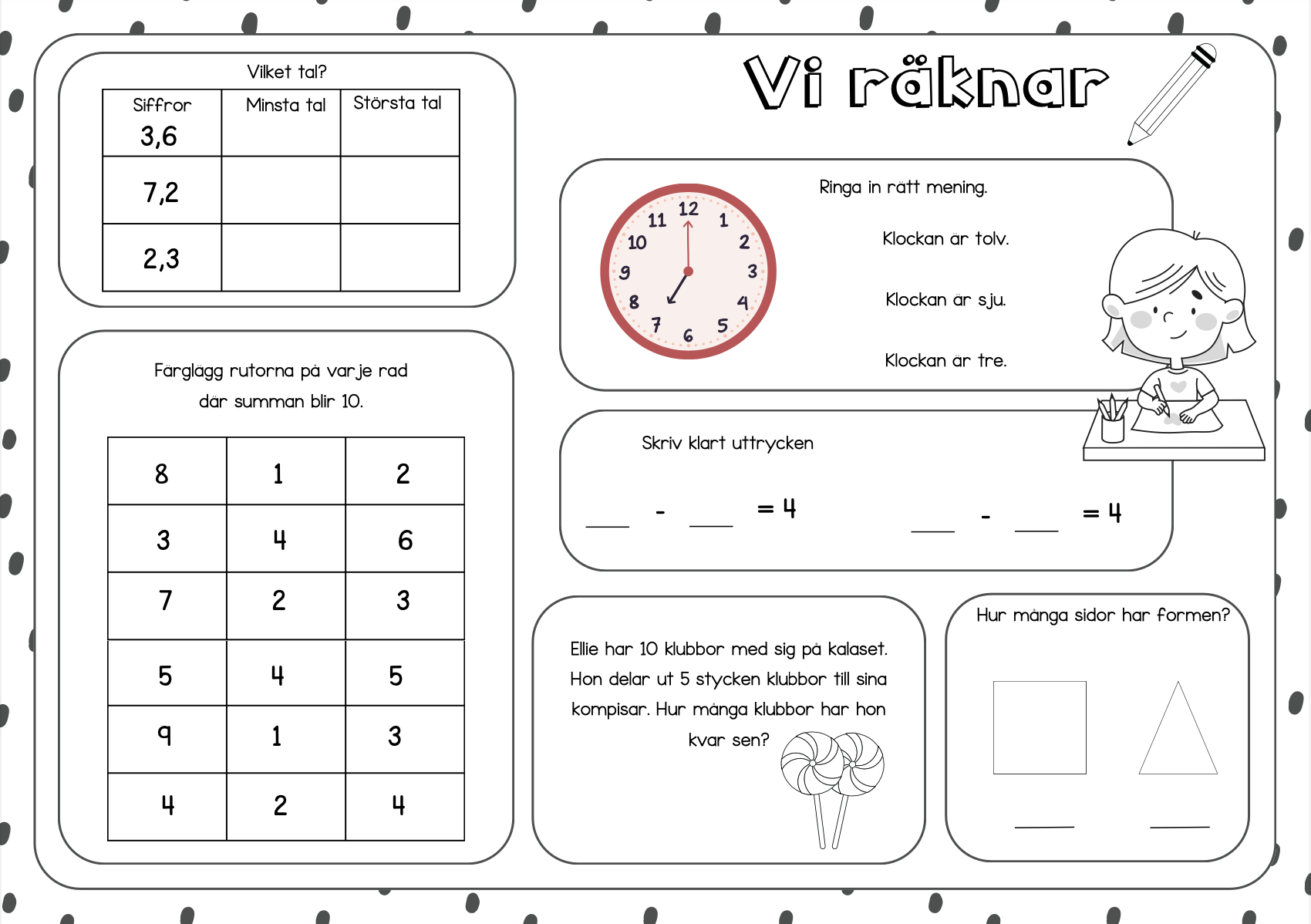 10 stycken sidor med blandade startuppgifter i matematik.