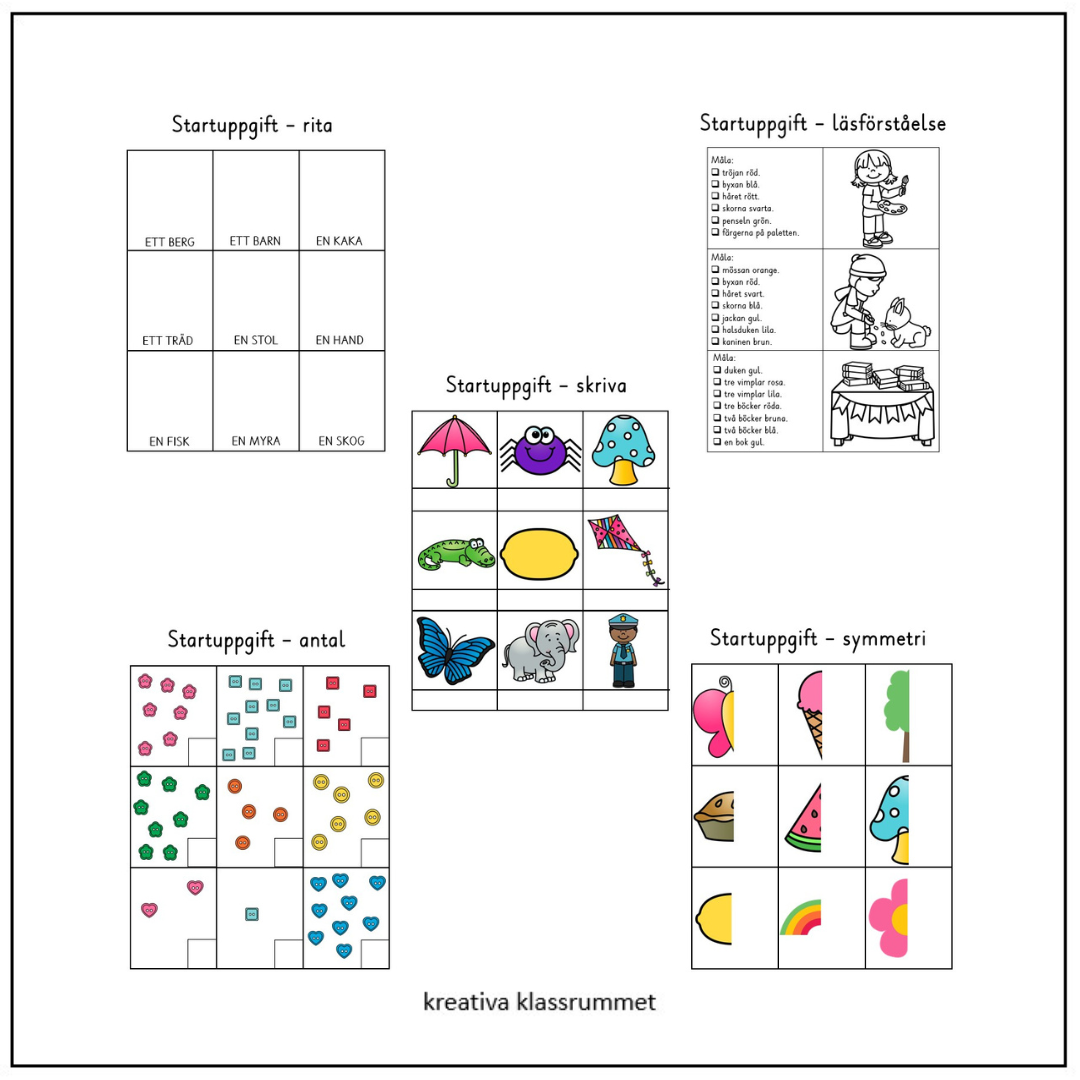Vi har skapat startuppgifter som vi använder på morgonen, när vi väntar på att alla är på plats och/eller när eleven är klar med sin uppgift. Uppgifterna går att använda som lösblad eller ihopsatta till ett häfte.